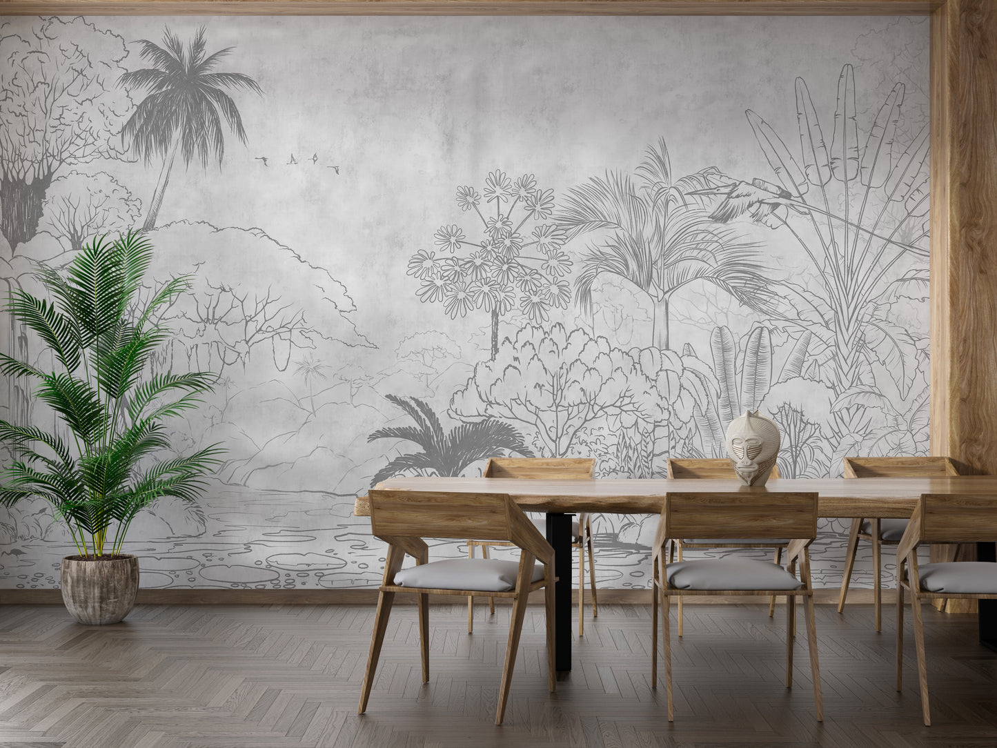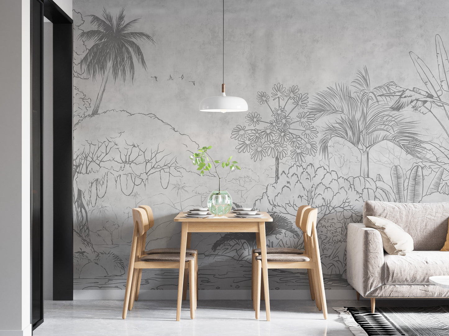 The tropical nature landscape grey colour mural wallpaper is a captivating choice for those looking to incorporate a touch of nature into their decor. This landscape wallpaper features a stunning portrayal of a tropical scenery, all beautifully rendered in various shades of grey. The monochromatic design lends a modern and stylish flair, making it a versatile addition to any room, be it a home or office setting. The grey wallpaper seamlessly blends the vibrancy of nature with a chic, understated colour scheme, creating a visually striking impact. Perfect for accent walls or complete room transformations, this mural offers a unique way to bring the essence of the outdoors indoors. The high-quality print ensures that every detail of the lush, tropical landscape is vivid and lifelike, providing a mesmerizing backdrop that captivates and inspires. This wallpaper is an ideal choice for anyone looking to merge natural beauty with contemporary design elements.
