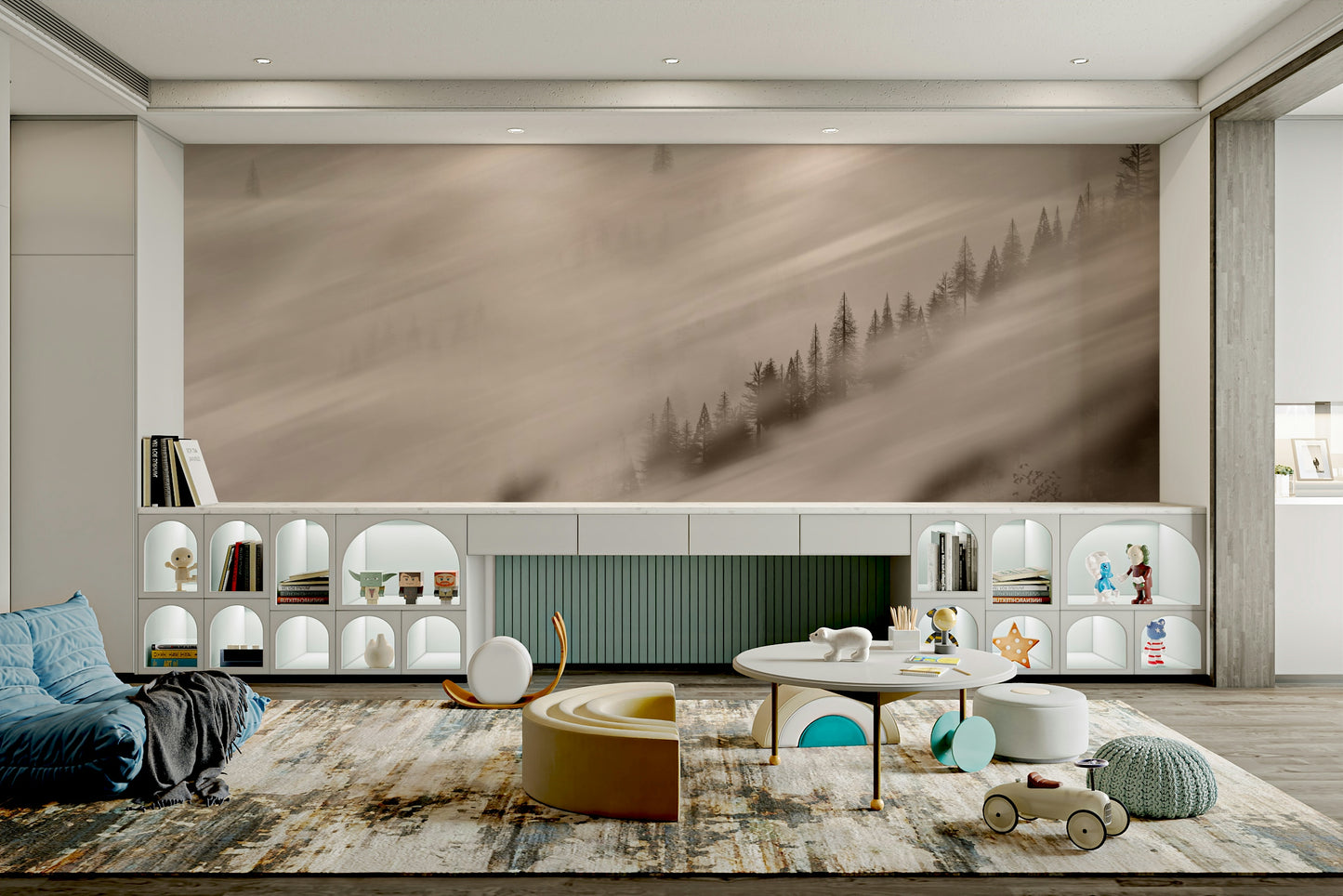 Misty sepia forest mural – Forest Valley Sepia Wallpaper