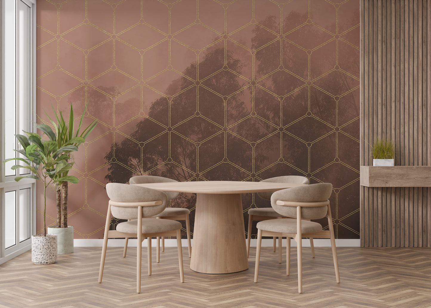 Our golden grid forest wallpaper mural brings a modern twist to natural beauty. Featuring a stunning geometric design overlaying a serene forest scene, this mural is perfect for adding a unique touch to any room. The golden grid pattern adds a luxurious feel, making it an ideal choice for contemporary interiors. Whether you're looking to update your living room or create a statement wall, this geometric wallpaper mural offers a blend of elegance and sophistication that will captivate your senses. Transform your space with this mural, creating a stunning focal point in any room.