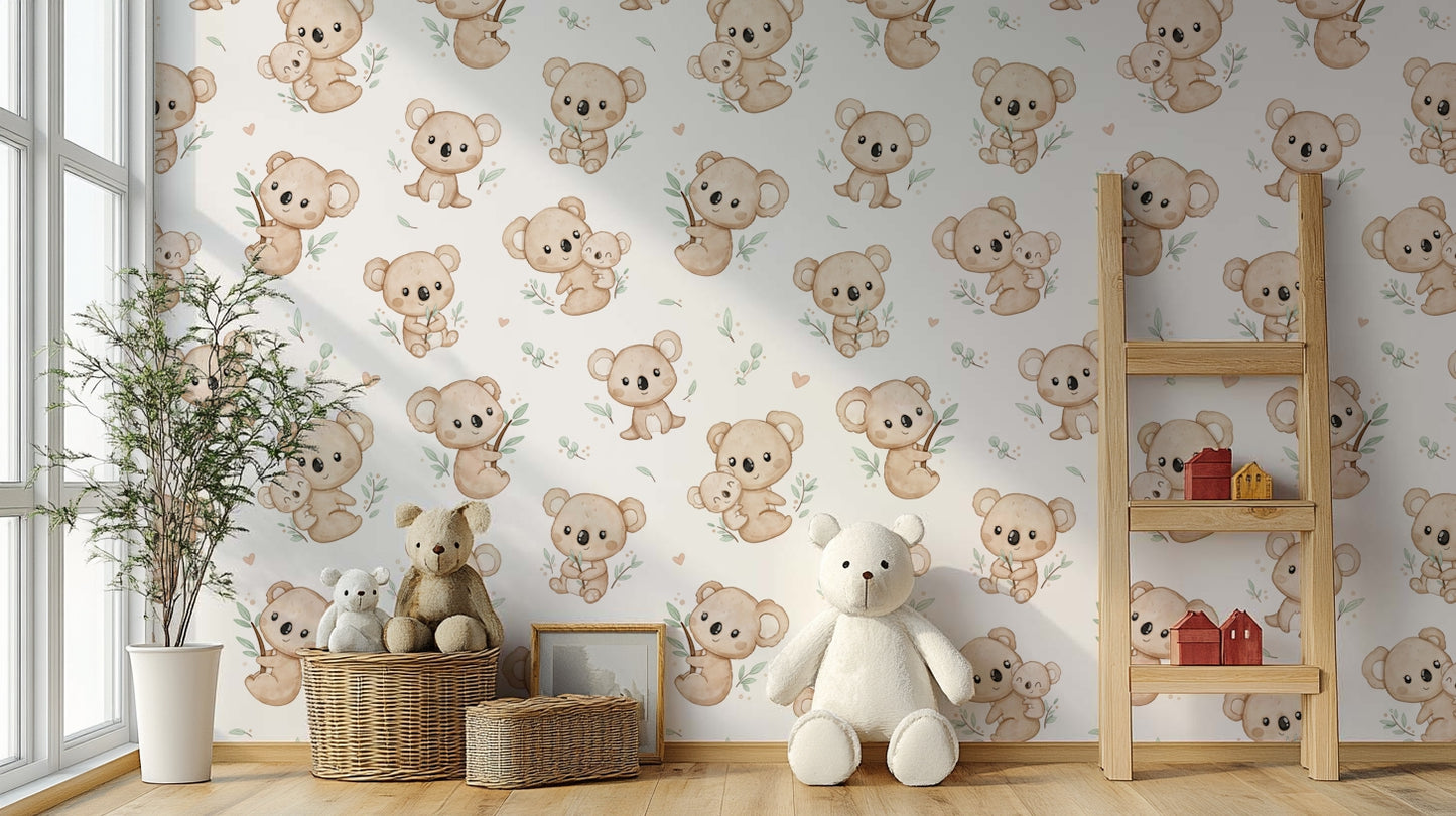 Bring a touch of whimsy and warmth to any room with Koala Cuddles wallpaper. Featuring adorable koalas nestled among eucalyptus leaves, this charming design is perfect for creating a cozy, inviting atmosphere. Ideal for nurseries or children's rooms, it adds a playful yet soothing element to your decor. Let these cuddly creatures inspire joy and comfort, making every day feel like a delightful retreat to the Australian bush. Add character and charm to your walls with this enchanting koala pattern.