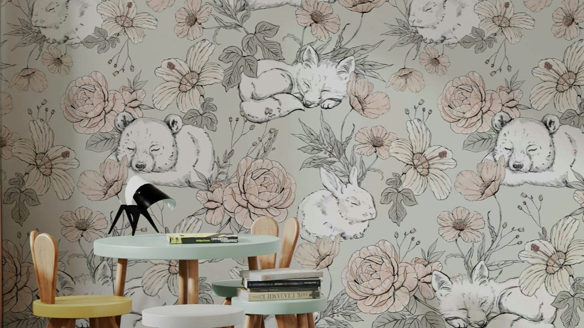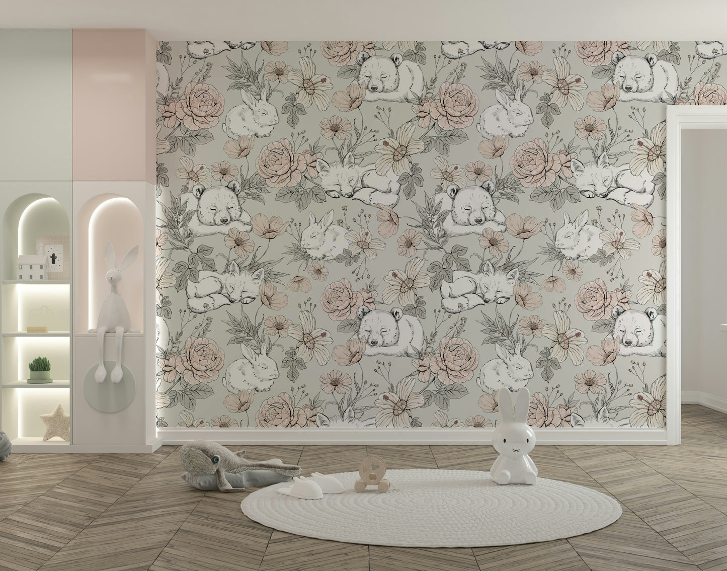 Drift into a gentle woodland dreamscape with our Sleeping Woodland – Sage Green wallpaper. Featuring softly sketched foxes, koalas, and bunnies nestled among hand-drawn florals, this design evokes peaceful forest scenes in delicate, earthy tones. The sage green backdrop adds a touch of natural calm, making it ideal for nurseries, reading corners, or toddler rooms. Every glance invites quiet wonder, helping little ones relax and feel at ease. Crafted for easy application and lasting charm, this wallpaper turns any wall into a whimsical retreat. Let your child’s space bloom with nature’s quiet magic and cuddly woodland friends.