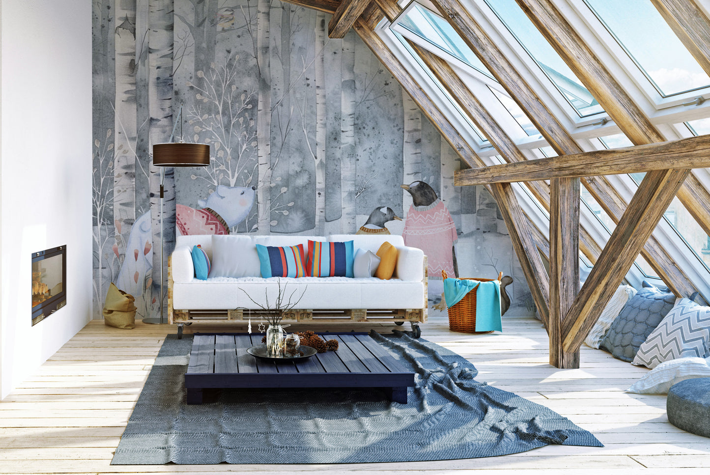 The winter woodland animal mural features a charming watercolor wonderland mural with penguins, a polar bear, and a squirrel dressed in cozy sweaters. The Scandinavian forest mural highlights delicate birch trees and soft pastel tones, creating a peaceful setting. This whimsical snowy forest wallpaper brings warmth and charm to nurseries, kids' rooms, and cozy living spaces. The Nordic birch tree wallpaper adds a gentle touch of nature with hand-drawn details and soothing hues. The cute animal illustration mural captures the magic of winter, making it an ideal choice for those who love enchanting and nature-inspired interiors.