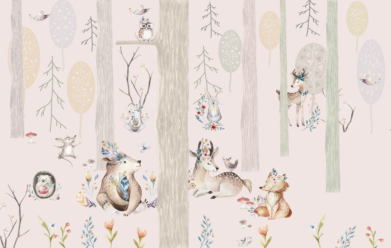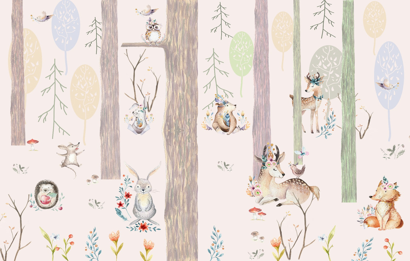 Discover our nursery wallpaper featuring cartoon-style rabbits, foxes, pandas, and squirrels, adding cuteness to the extreme. It refreshes the little ones and sparks curiosity about the four-legged furry friends.