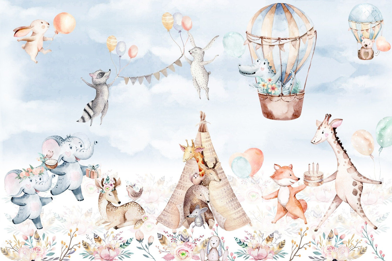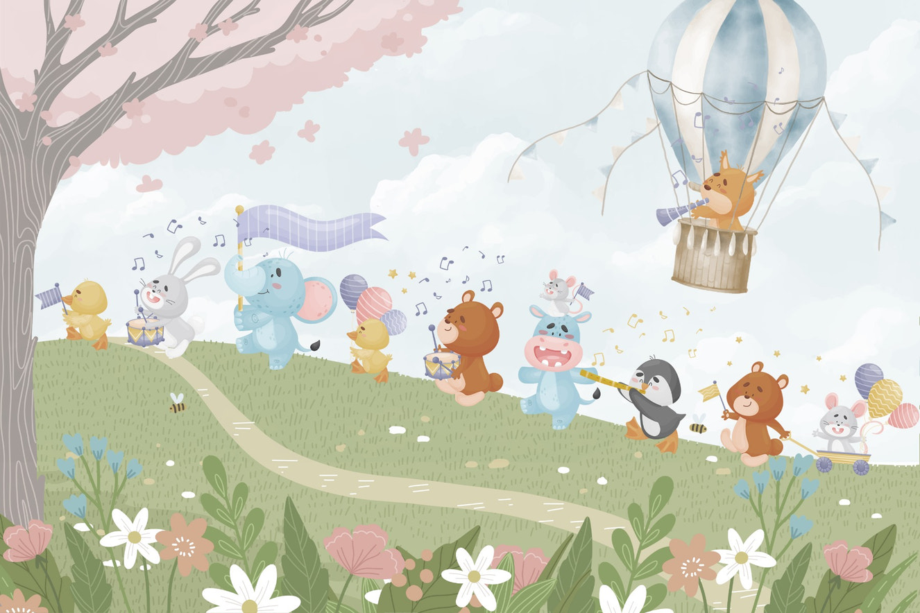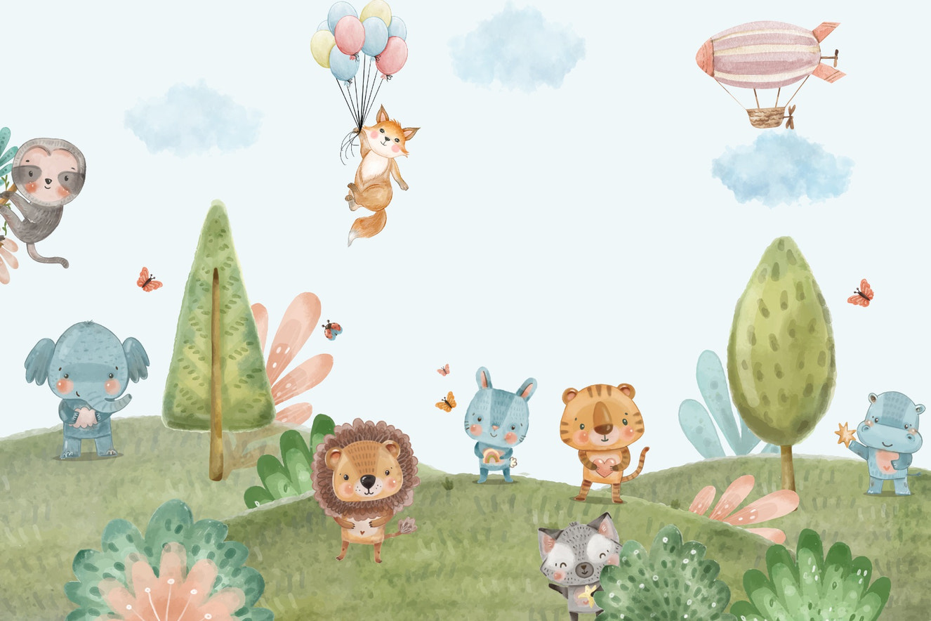 Discover our nursery wallpaper featuring cartoon-style rabbits, foxes, pandas, and squirrels, adding cuteness to the extreme. It refreshes the little ones and sparks curiosity about the four-legged furry friends.