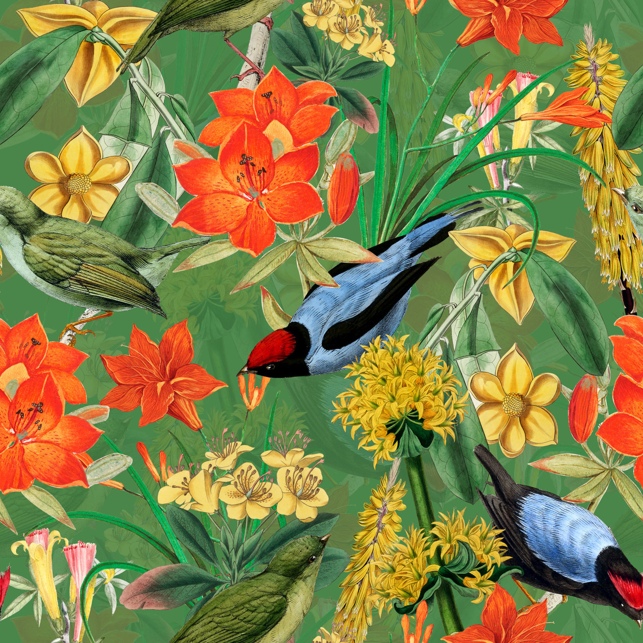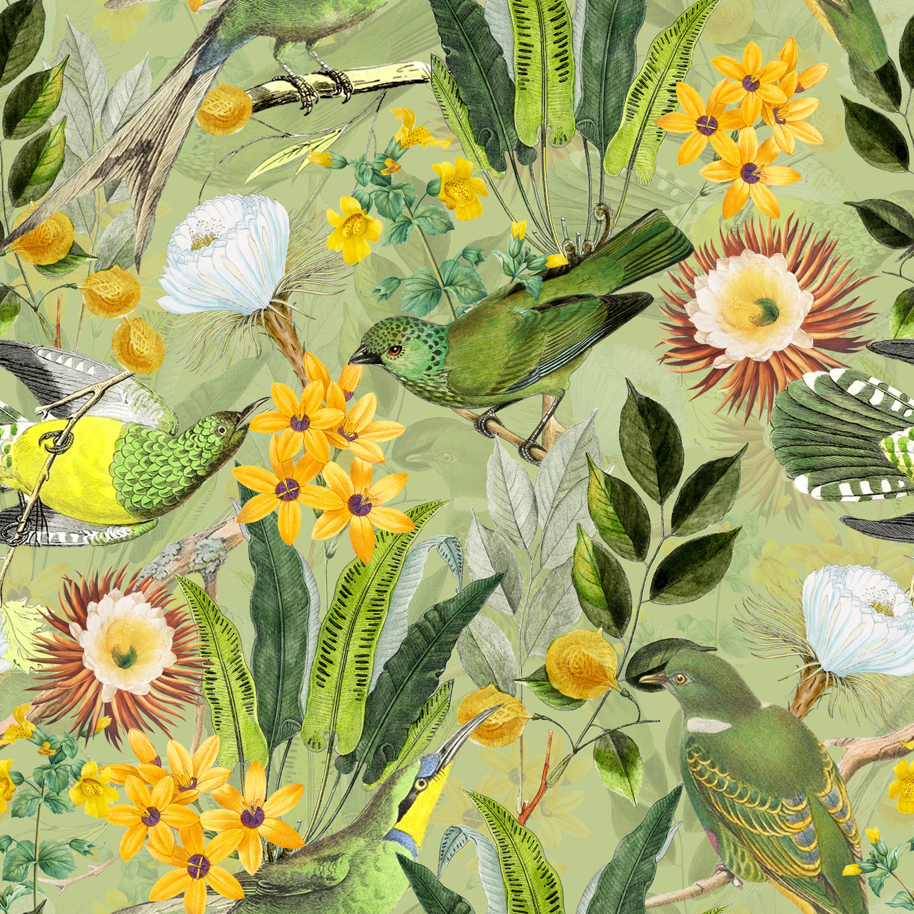 Green Wallpaper lets you enjoy both the beauty of birds and the relaxing effects of nature. Designs like jungle bird oasis have lots of different birds and lush green backgrounds, which makes for a calm and relaxing space that's great for babies or living rooms.