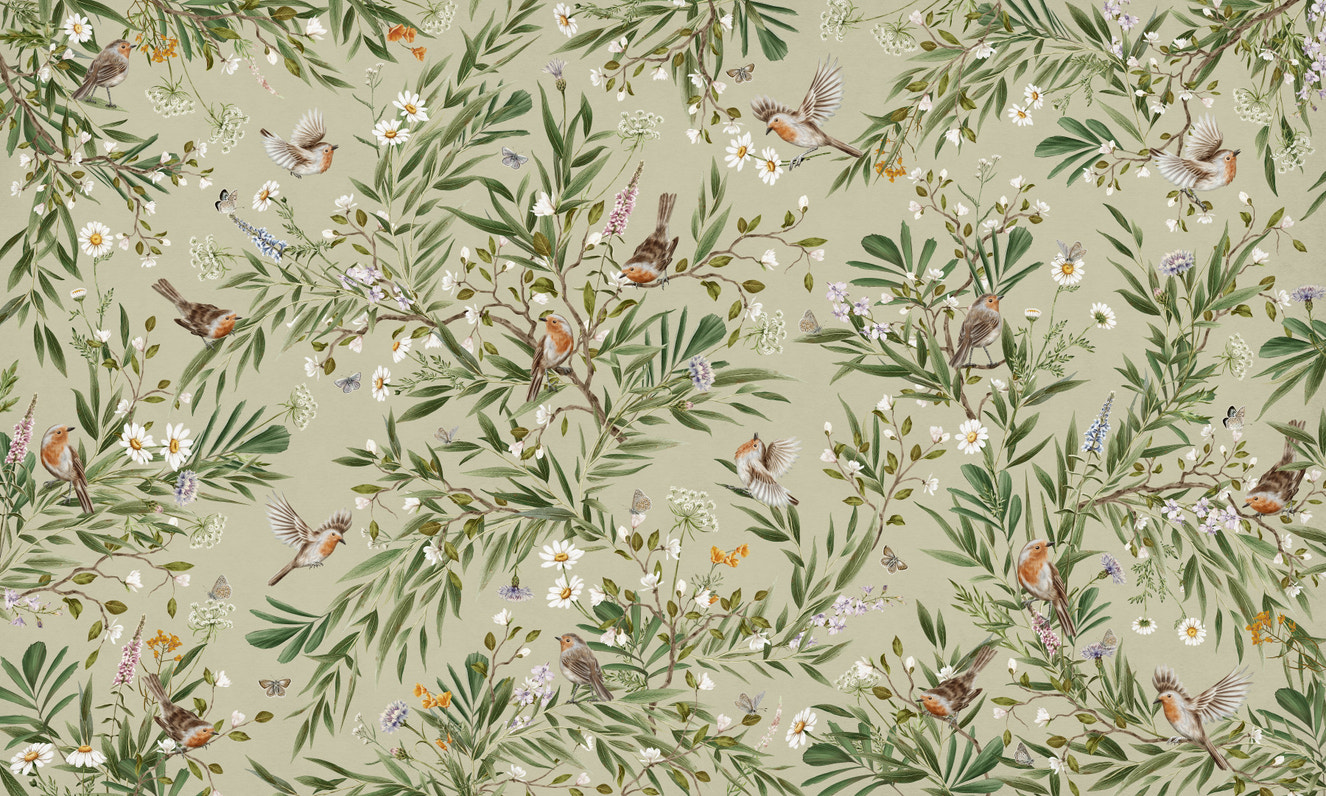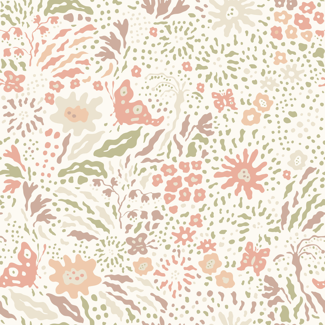 The watercolour garden wallpaper with butterflies looks soft and artsy. The soft mix of colours and butterfly pictures gives any wall a calm, artistic touch and makes for a peaceful background that feels classic.