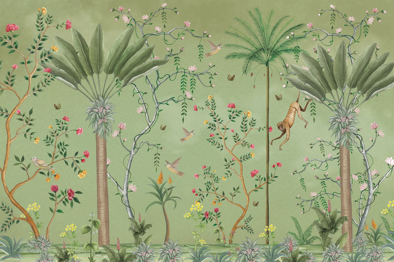 Flowers and other plants on green chinoiserie wallpaper bring the beauty of nature into your room. Design ideas that are based on gardens look nice with this. It goes with both modern and traditional types of decor.