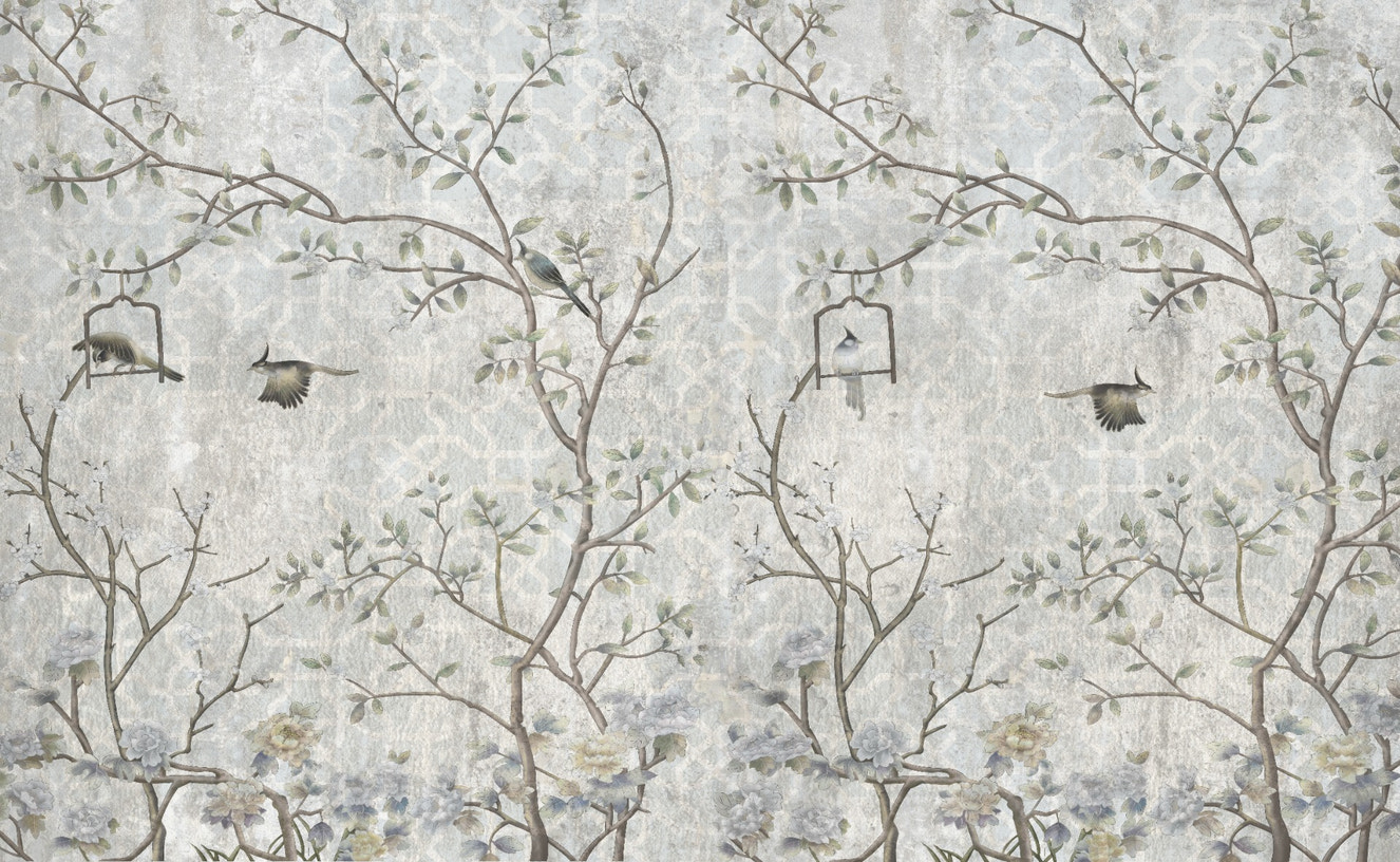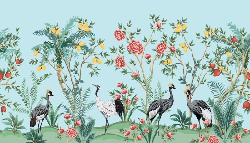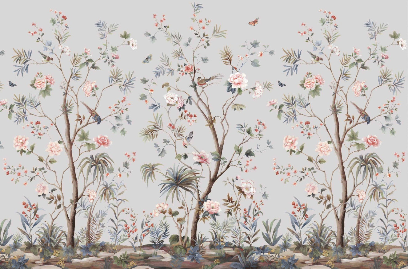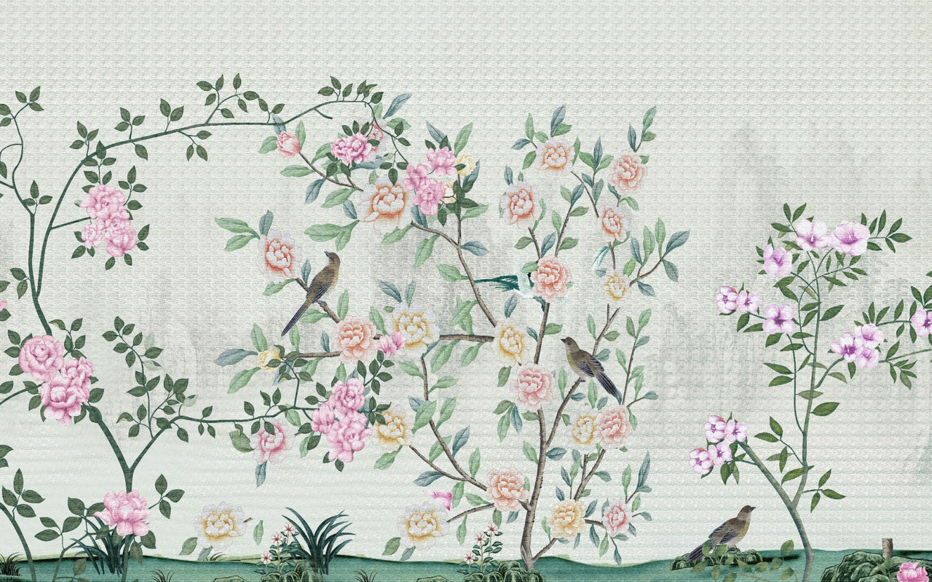The chinoiserie bird garden wall mural captures the charm of wildlife scenes with delicate birds perched in an enchanting garden setting. This mural blends nature's beauty with intricate details, making it ideal for a sophisticated, nature-inspired decor.