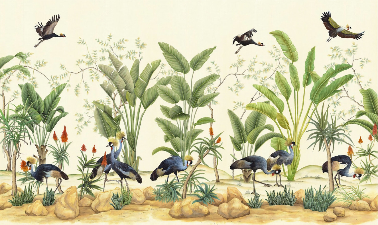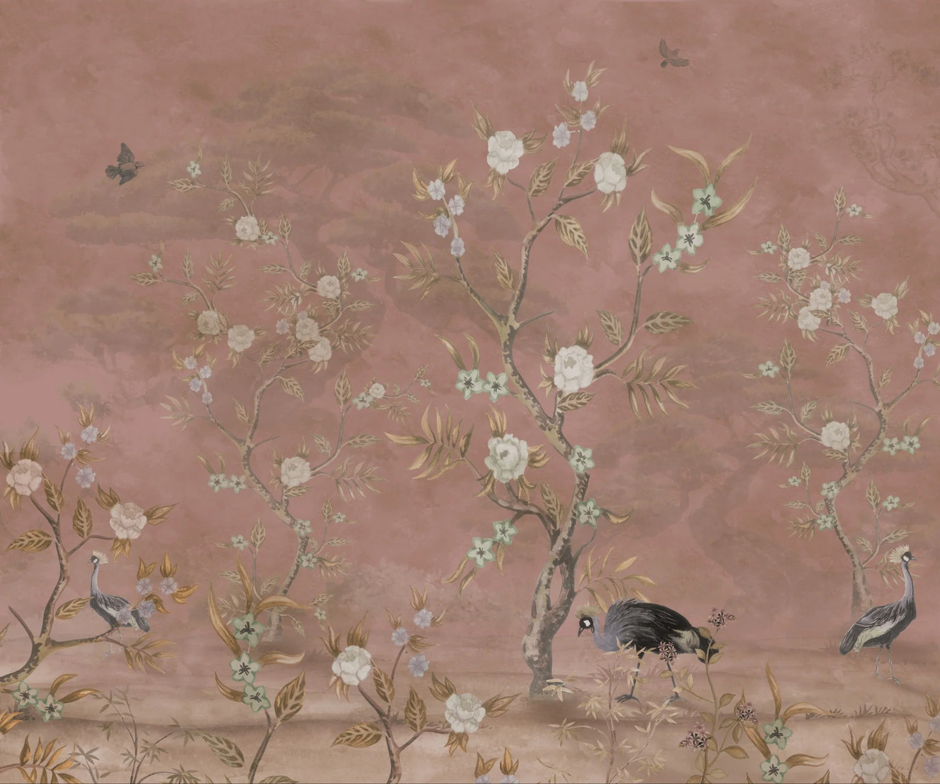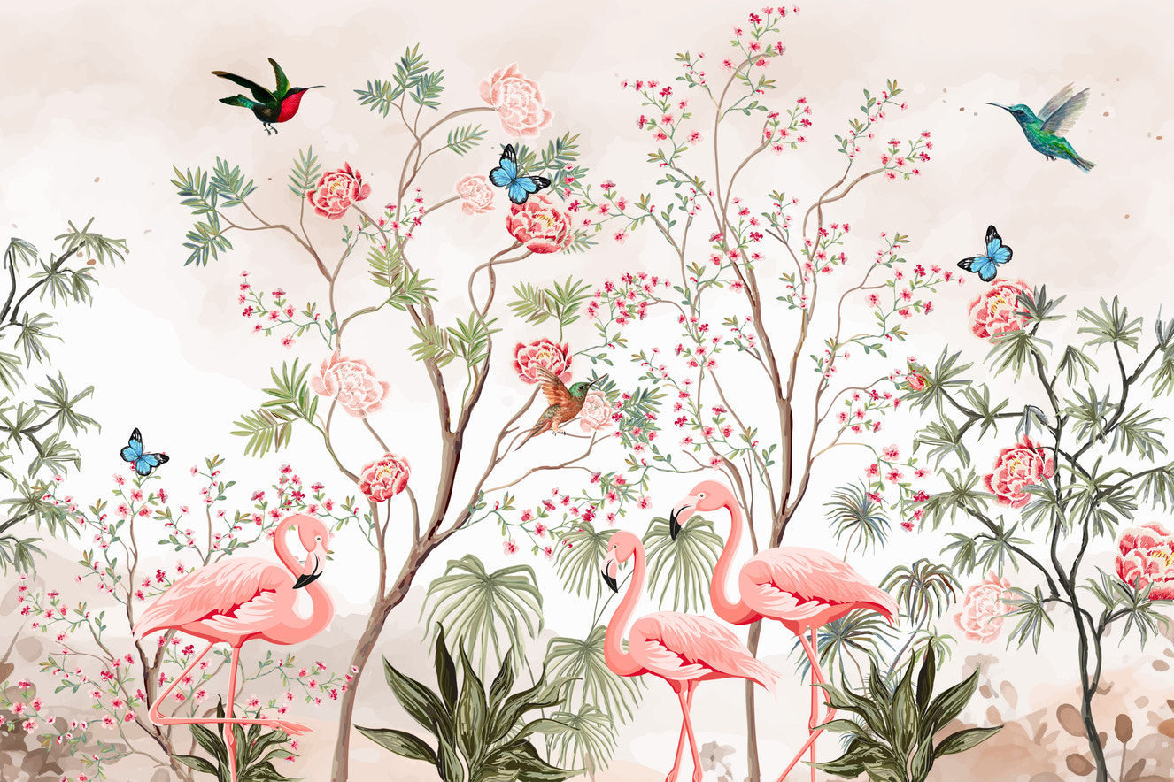 The chinoiserie bird garden wall mural captures the charm of wildlife scenes with delicate birds perched in an enchanting garden setting. This mural blends nature's beauty with intricate details, making it ideal for a sophisticated, nature-inspired decor.