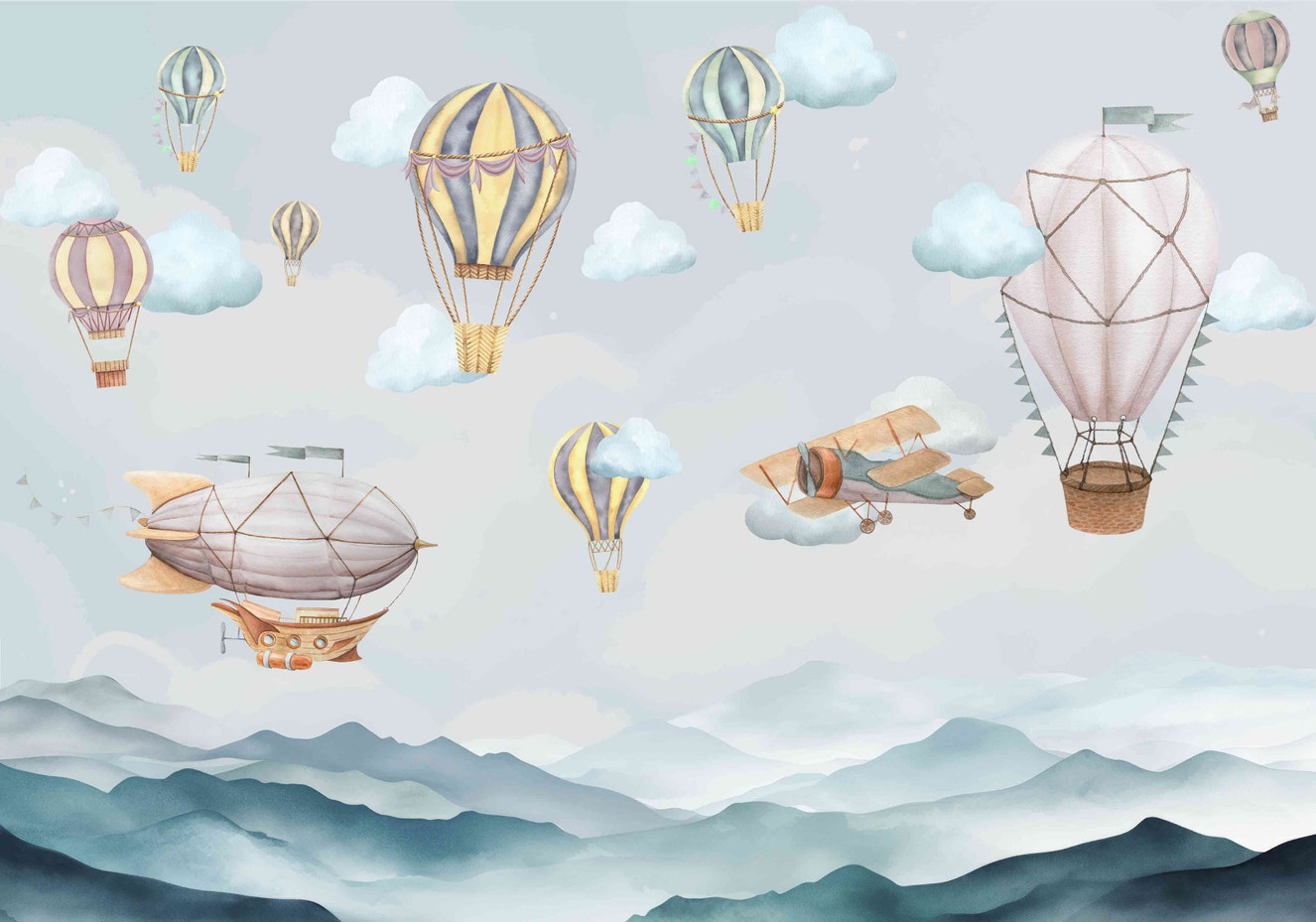 An air balloon watercolour wall mural has a soft, artistic look. The dreamy colours and soft brushstrokes make the room feel calm and peaceful, making it perfect for babies or places to relax. They give the room an elegant but fun vibe.