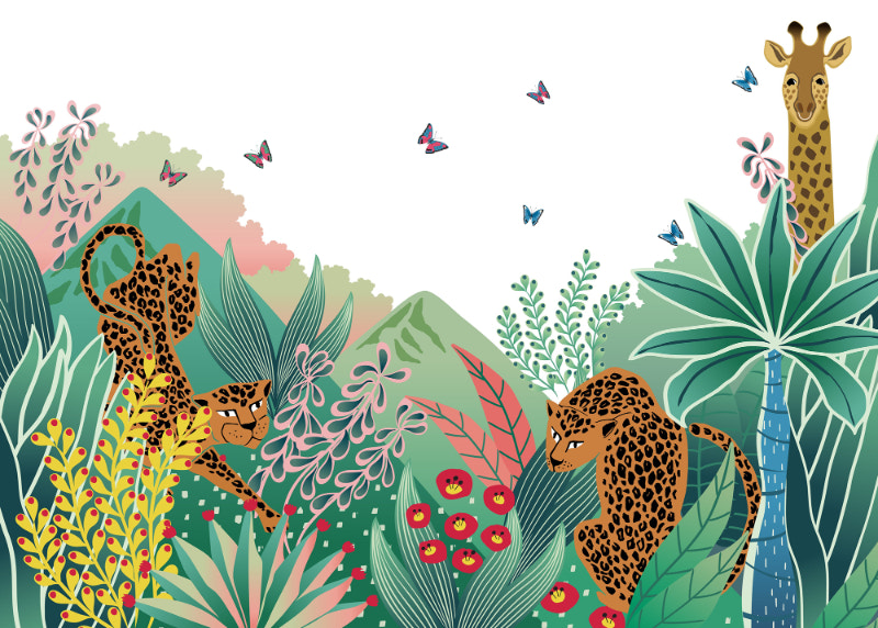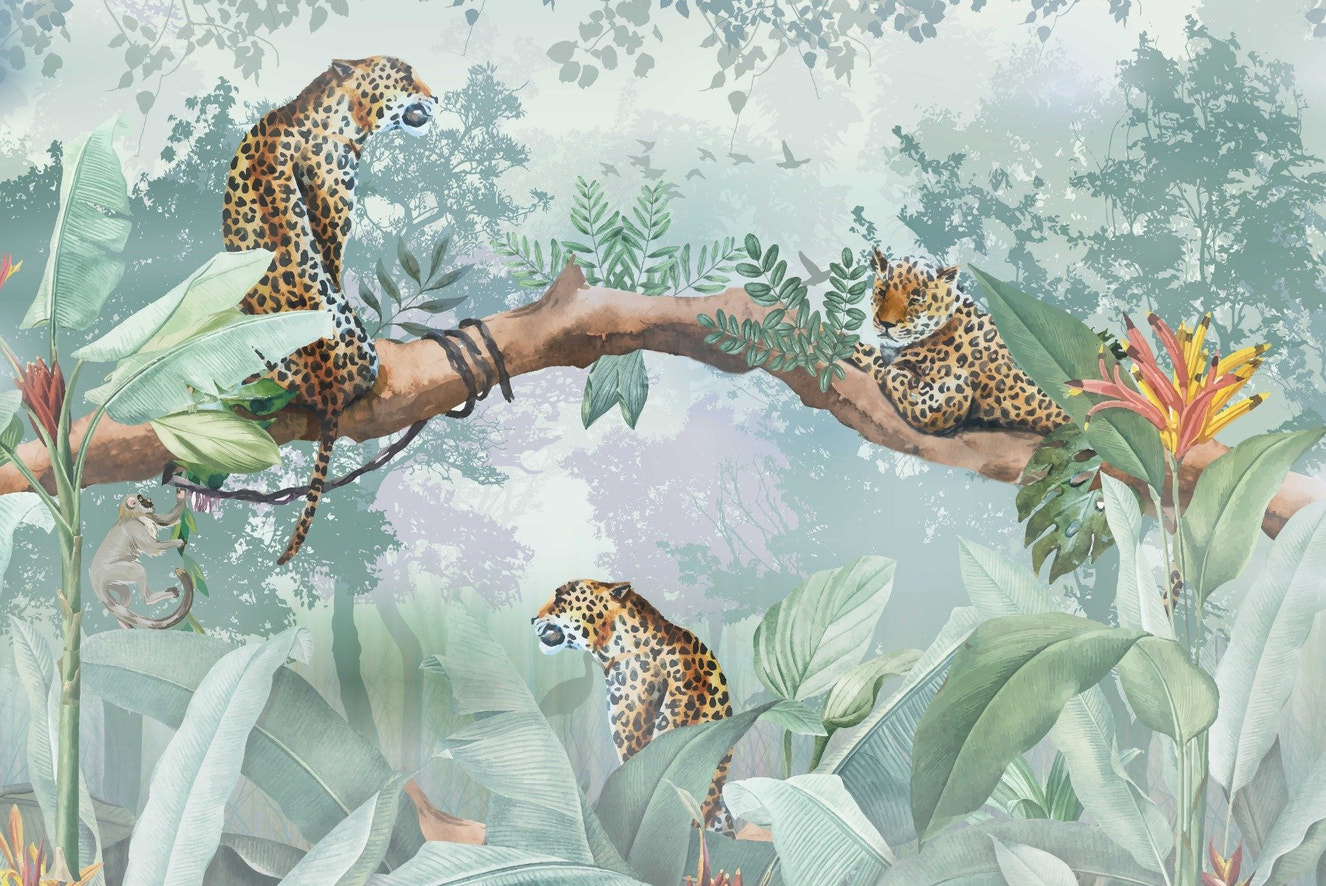 Our jungle animal wallpaper mural for kids is meant to get their imaginations going. This mural makes a child's room look like a fun safari with its friendly leopards and other jungle animals. This is a fun and helpful way to make a bedroom or playroom look nice.