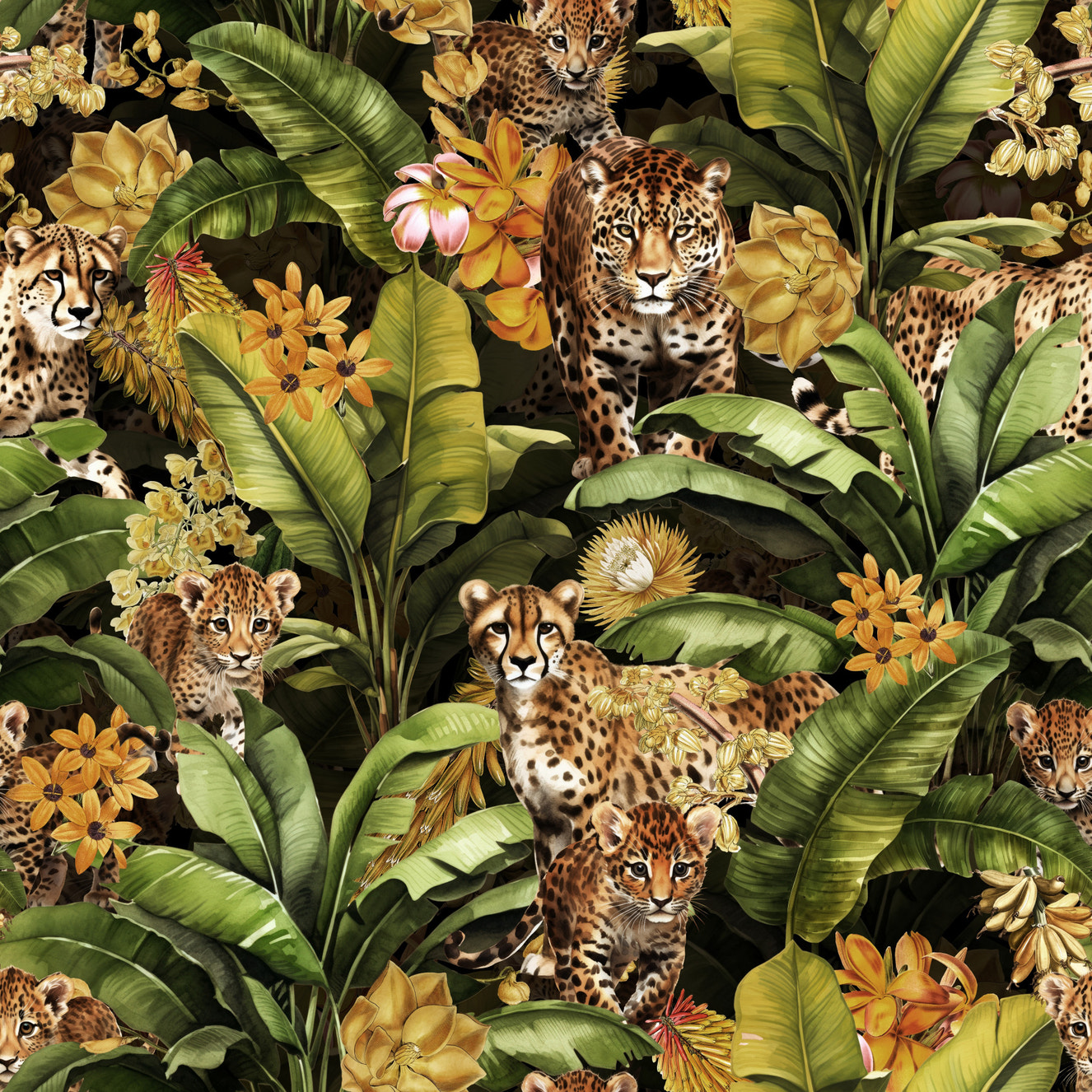 Bring some wildness into your home with our green jungle leopard pattern wallpaper. This design pairs the beauty of leopards with the cool colours of jungle plants. If you want to make a place that is full of life and colour, this is a great choice.