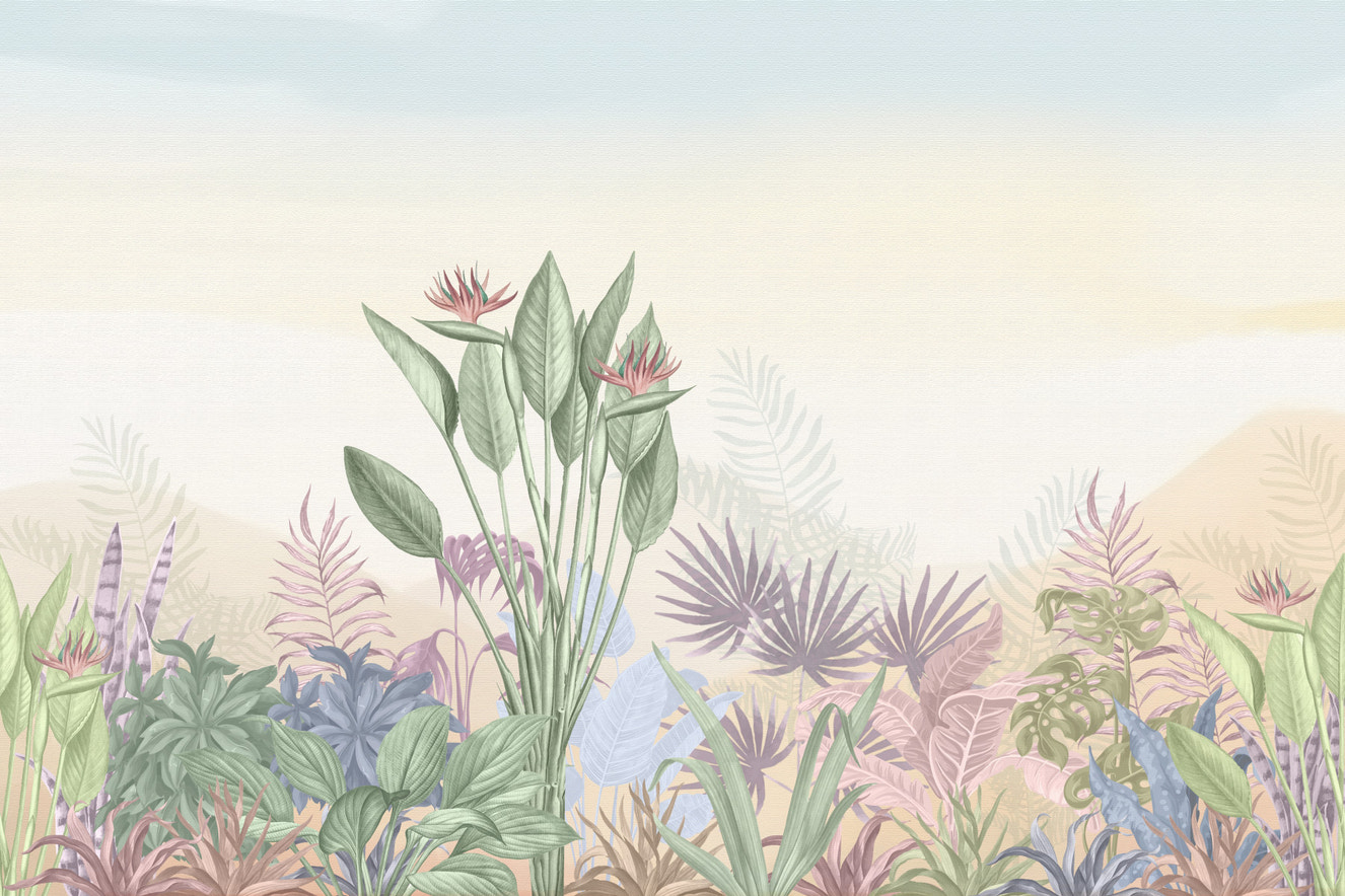 Botanical charm contemporary wallpaper mural has images based on nature but with a contemporary twist. Leafy designs and flowers in soft colours can make a room feel calm and fresh, which makes them great for bedrooms and living rooms.