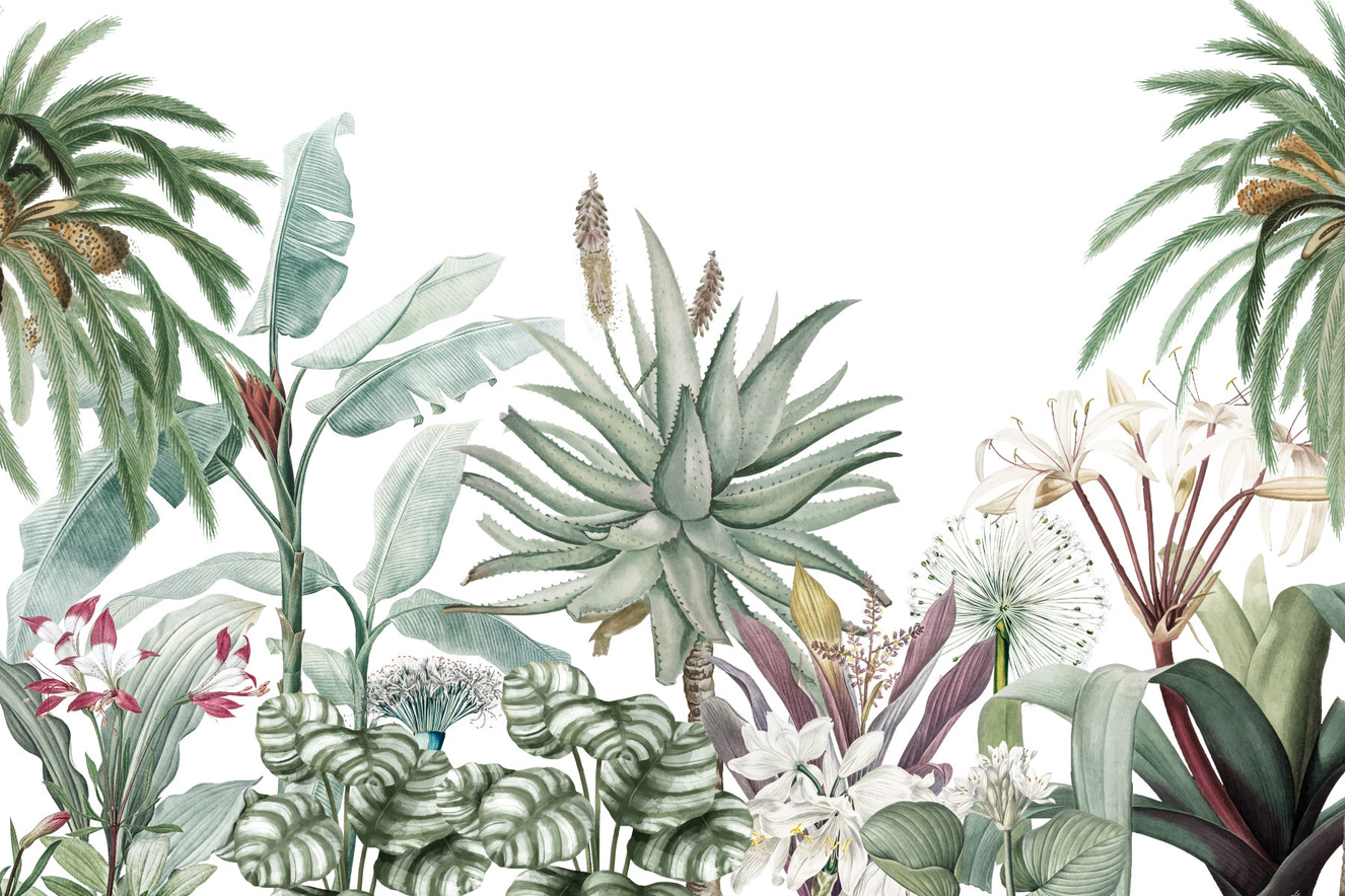 Tropical foliage wallpaper focuses on the overall botanical aesthetic, featuring a mix of lush plant life like ferns, flowers, and various leaves. It's designed to bring a rich, serene, and organic feeling of nature indoors.