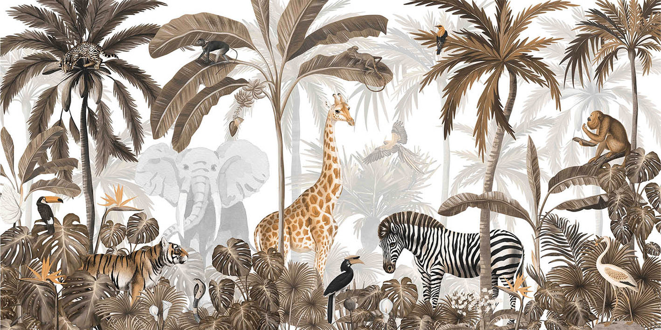 Adding to this is vintage nature-inspired style wallpaper, which presents the classic Safari themes in very soft and pale retro colours, perfect for adding a touch of timeless elegance to your home even as you embrace the beauty of a Safari landscape.