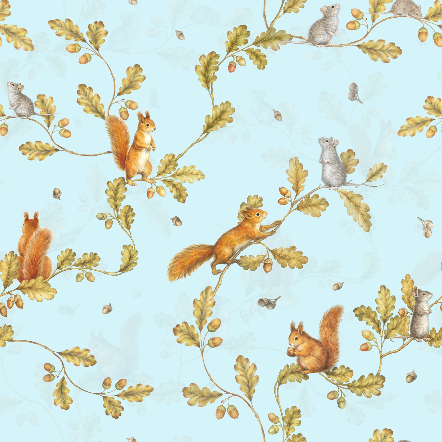 18th Rococo Forest Chinoiserie with Squirrels and Mice on Oak Tree Branches Blue Wallpaper⁠