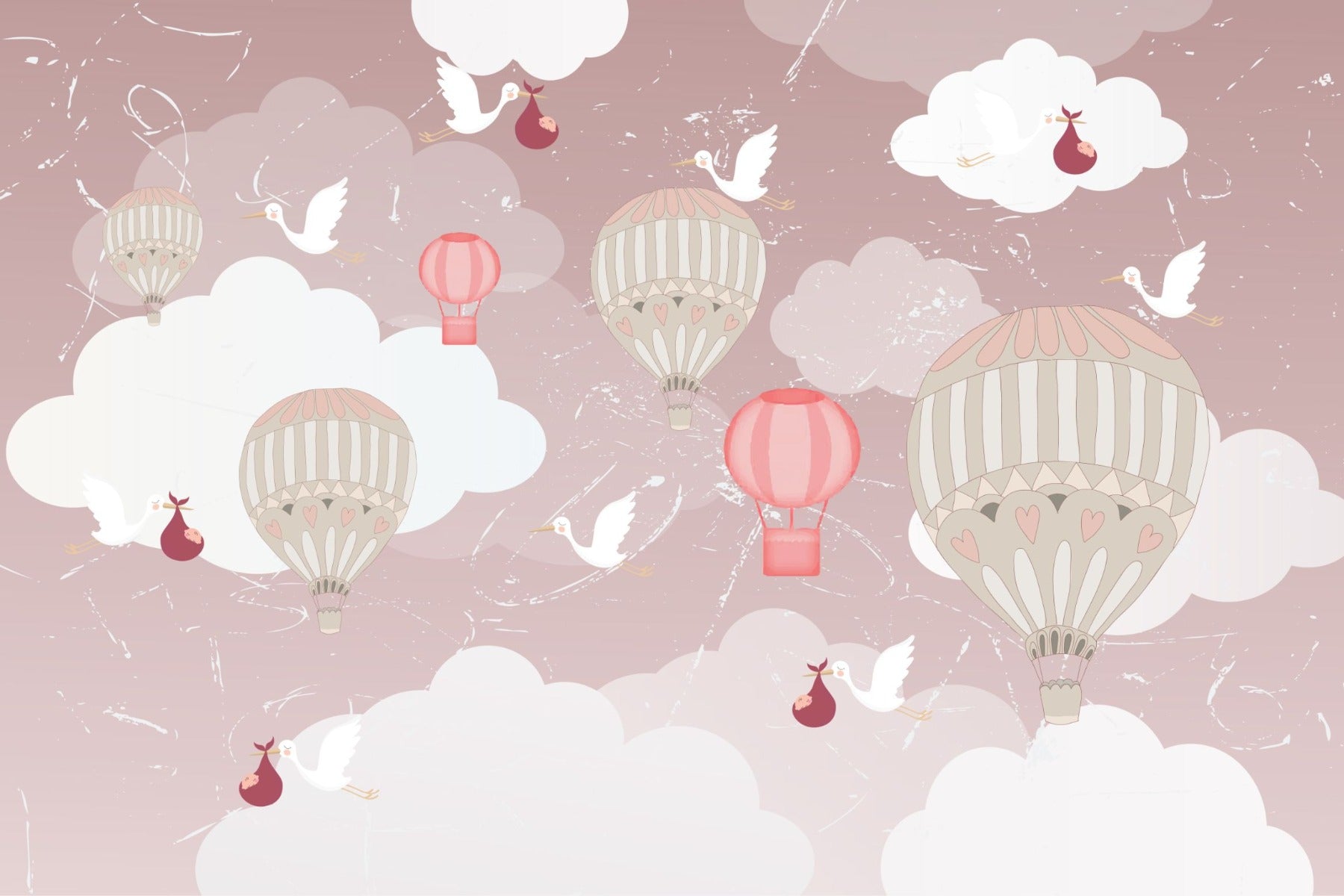 Pastel 3D wallpaper with hot air balloon and stork details.