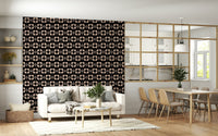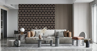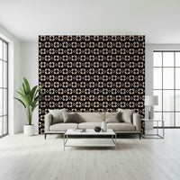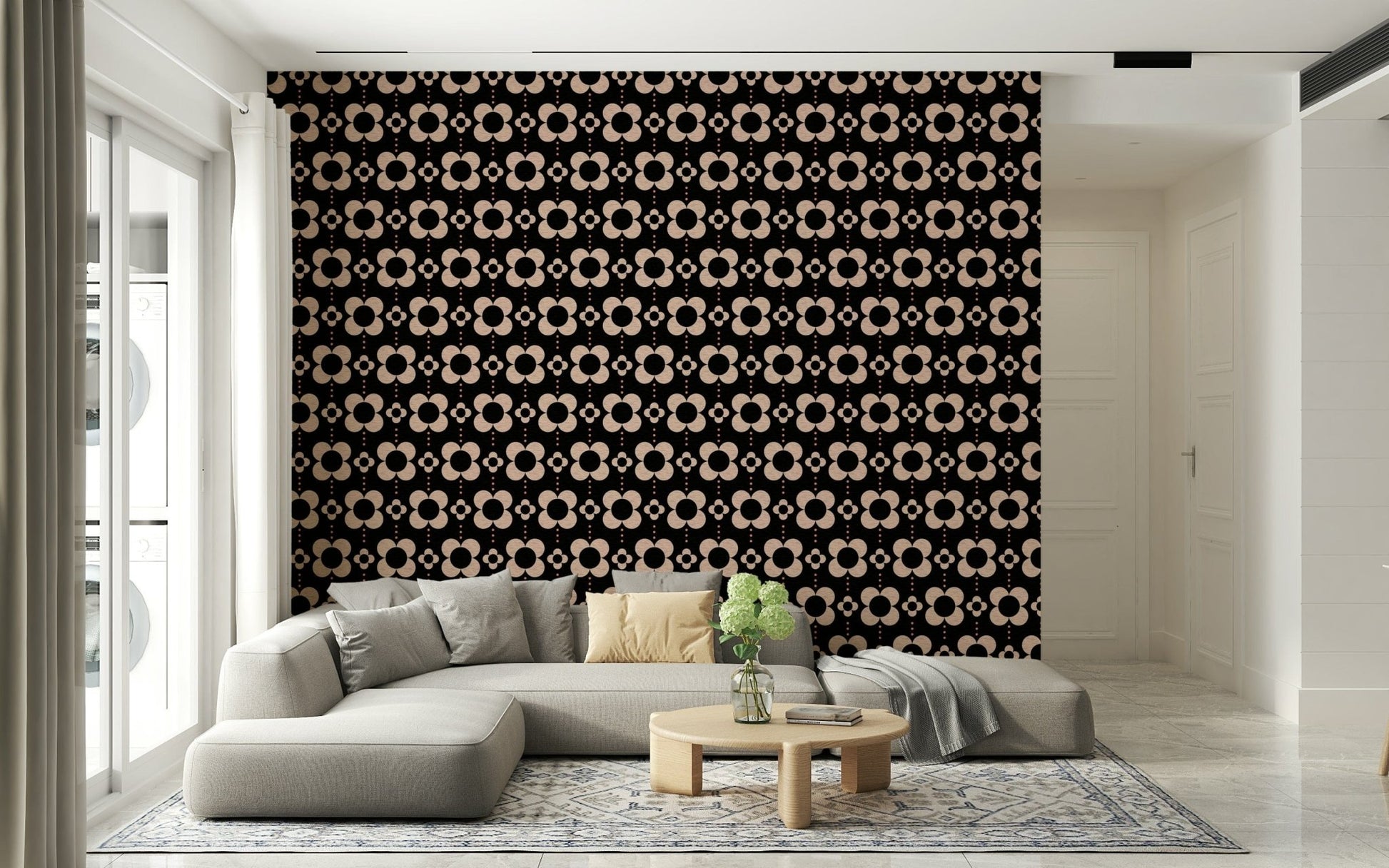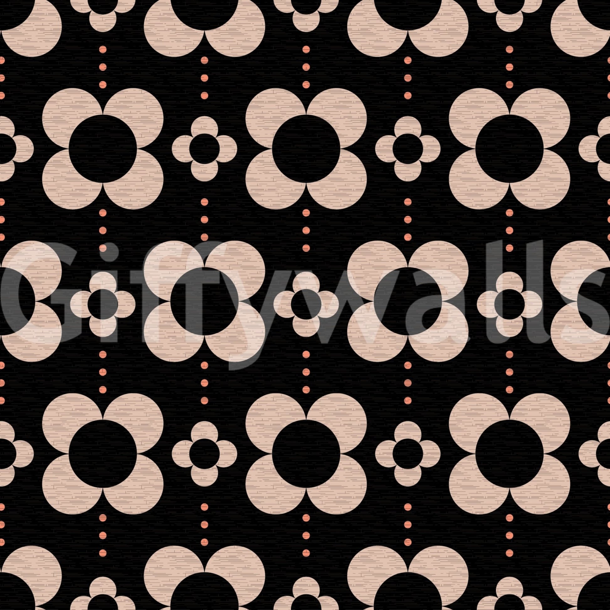 60s Charm brings a bold dose of mid-century charm with oversized stylized daisies arranged in a rhythmic repeat. The contrast of soft beige petals against a deep black background creates a striking yet cozy visual balance. Subtle dotted lines between blooms add a playful movement that feels timeless and chic — ideal for elegant interiors with mid-century vibe.
