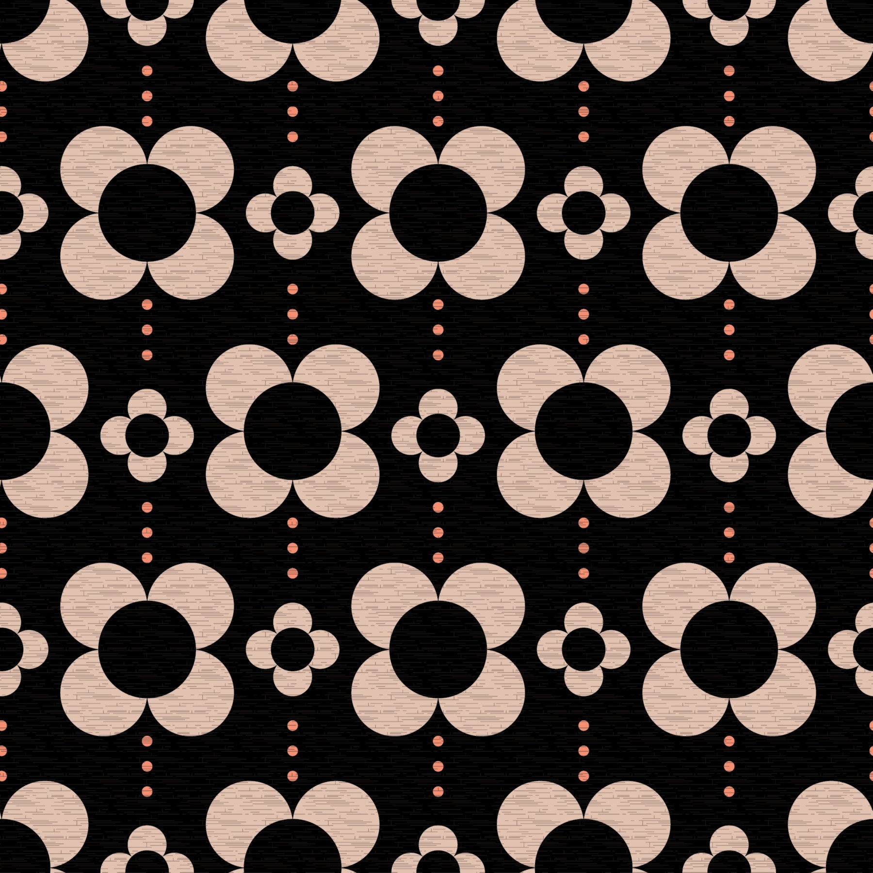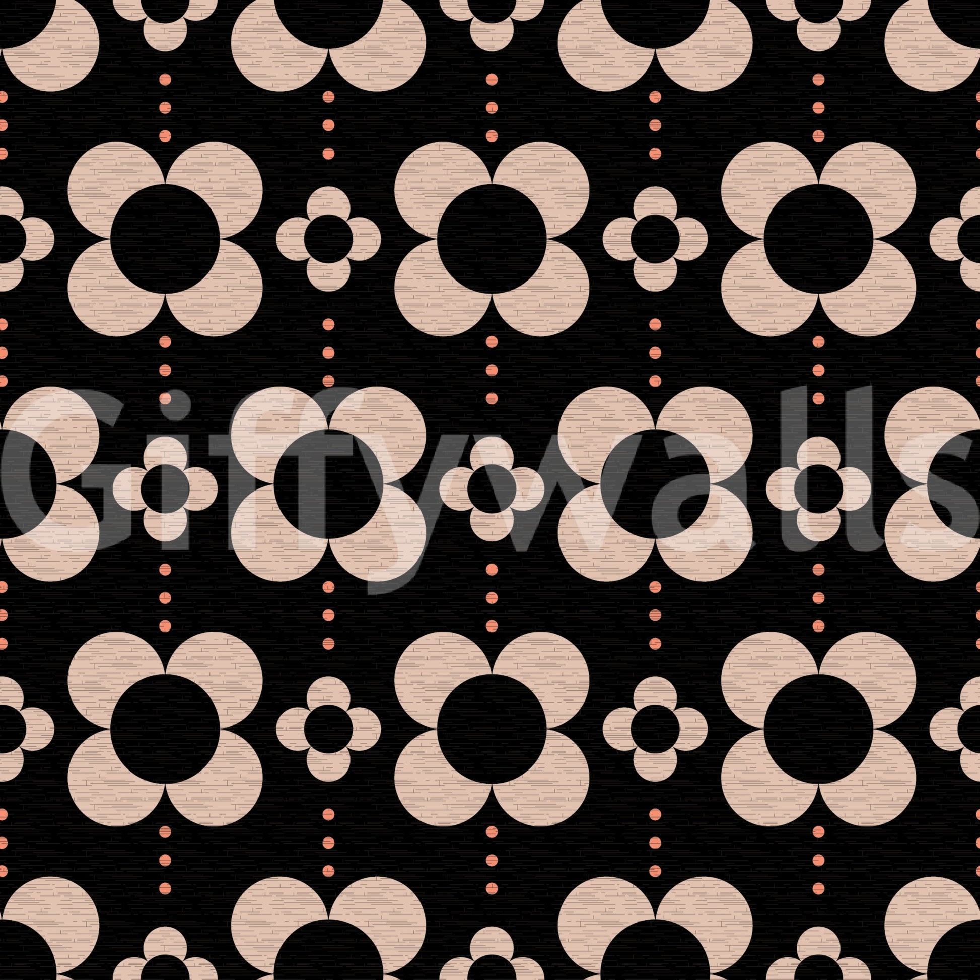 60s Charm brings a bold dose of mid-century charm with oversized stylized daisies arranged in a rhythmic repeat. The contrast of soft beige petals against a deep black background creates a striking yet cosy visual balance. Subtle dotted lines between blooms add a playful movement that feels timeless and chic — ideal for elegant interiors with mid-century vibe.