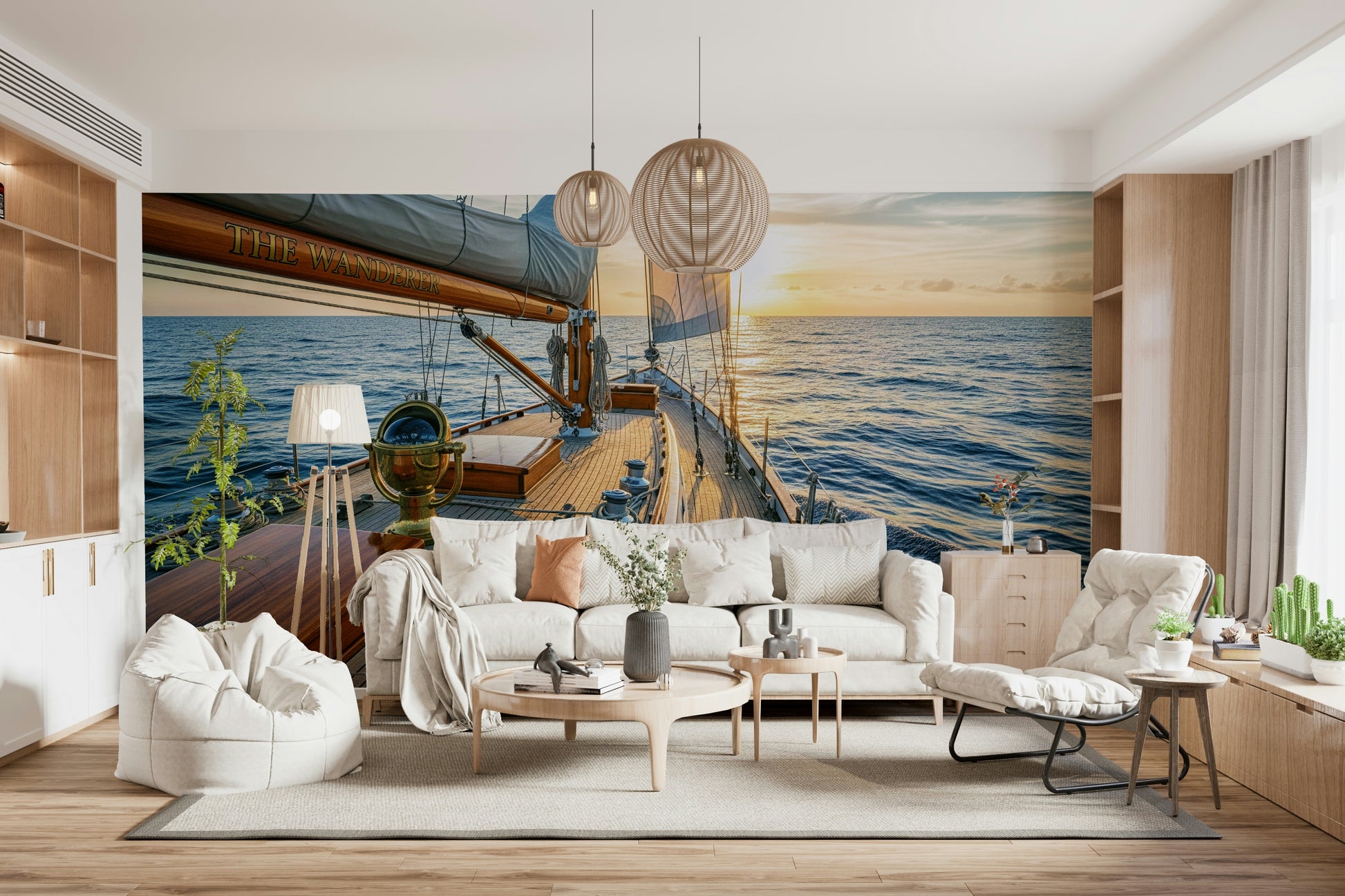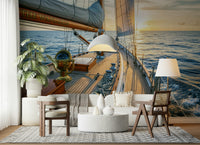 Imagine the endless horizon with this captivating wallpaper for walls. The deck of a sailboat is the focal point, leading your eye to the meeting of sea and sky at sunset. The craftsmanship of the wooden deck, combined with the gleaming brass details, creates a feeling of luxury and adventure. Use this design to infuse your bedroom, living room or even a hallway with a serene, nautical vibe that enhances the interior space with a blend of comfort and maritime charm.