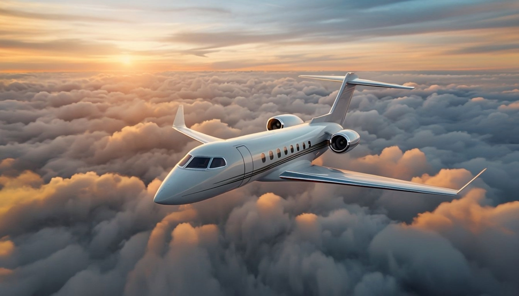 Elevate your space with this breathtaking vista of a jet flying over a sprawling cloudscape. This refined wallpaper captures the essence of luxury and travel. Notice how the sun's golden rays dance across the clouds, creating a tranquil and inspiring ambiance. The clean lines of the aircraft contrast beautifully with the soft, billowing clouds. Transform any room into a haven of peace and sophistication. This wallpaper for walls makes a statement in a home office, bedroom, or even a modern living room, providing a touch of wanderlust and creating an open, airy feel.