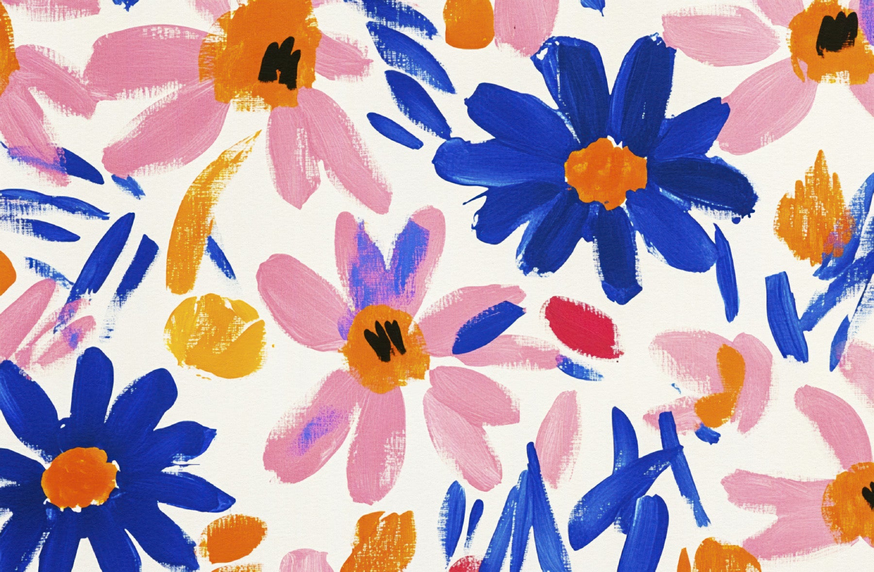 Immerse yourself in the vibrant world of "Abstract Matisse Flower Garden." This wallpaper captures the essence of Fauvist modern style with bold, non-naturalistic colors and simplified forms reminiscent of Matisse's iconic artwork. Pink and blue flowers, punctuated with striking orange centers and leaf accents, dance across a light background creating a lively and joyful scene. The visible brushstrokes and abstract composition enhance the artistic feel, making this a statement piece that brings a touch of modern art and playful energy to any space.