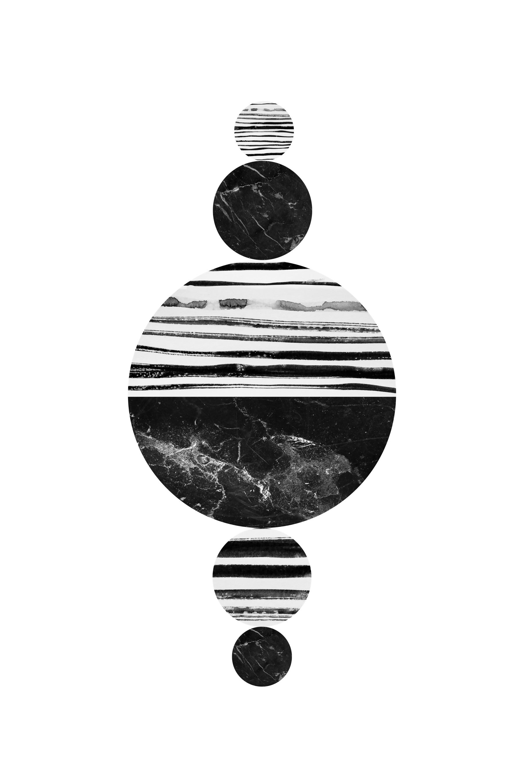 This striking wallpaper features a minimalist composition of abstract shapes, playing with contrasting textures and patterns. A central, large circle showcases a dramatic blend of black marble and bold, hand-painted white stripes, creating a dynamic visual tension. Smaller, similarly styled circles arranged vertically above and below enhance the overall sense of balance and elegance. The monochromatic palette of black and white accentuates the graphic simplicity, offering a sophisticated and modern aesthetic perfect for any digital device. The interplay of organic marble texture and geometric striped patterns results in a unique and captivating design.
