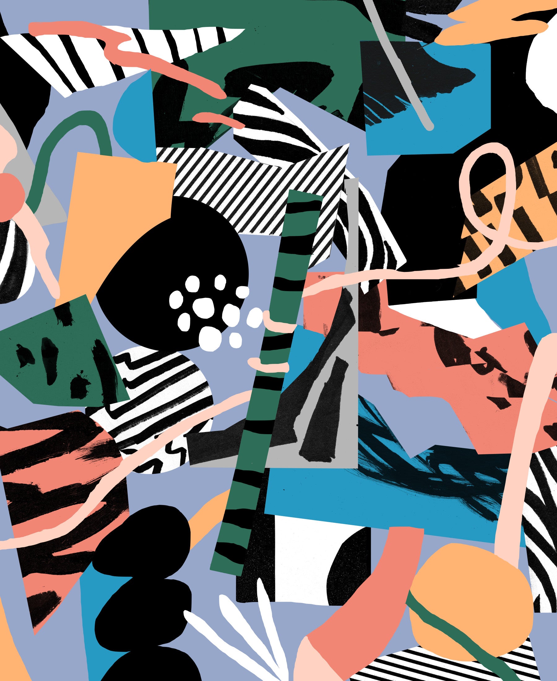 This contemporary wallpaper for walls features an array of geometric shapes, lines, and brushstrokes in a playful arrangement. A mix of black, white, blue, and coral creates a striking visual impact. It is an ideal choice for a living room, bedroom, or hallway. The design lends a modern art feel and easily elevates your interiors, especially when used as a feature wall.
