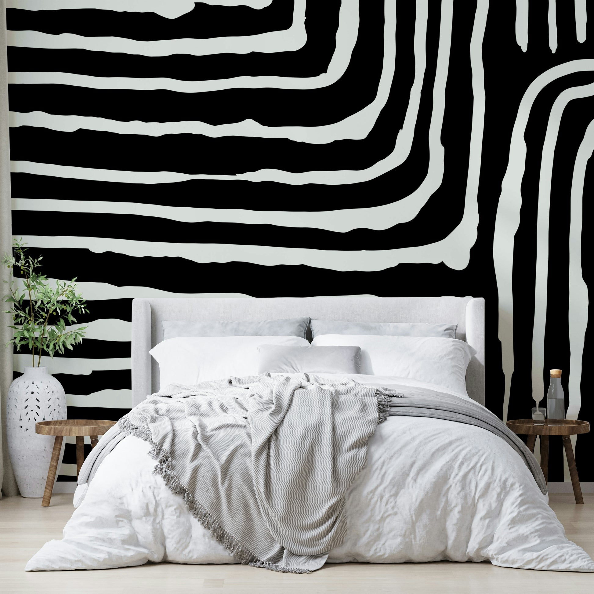 This wallpaper presents a captivating interplay of bold black and off-white stripes, arranged in a dynamic, abstract pattern. The uneven, hand-drawn quality of the lines adds a tactile and artistic feel, creating a visually engaging texture. The contrasting colors offer a striking yet balanced aesthetic, suitable for modern and contemporary spaces. This design is perfect for adding a touch of graphic sophistication to any room, from living rooms to bedrooms, creating a sense of bold simplicity and modern elegance.