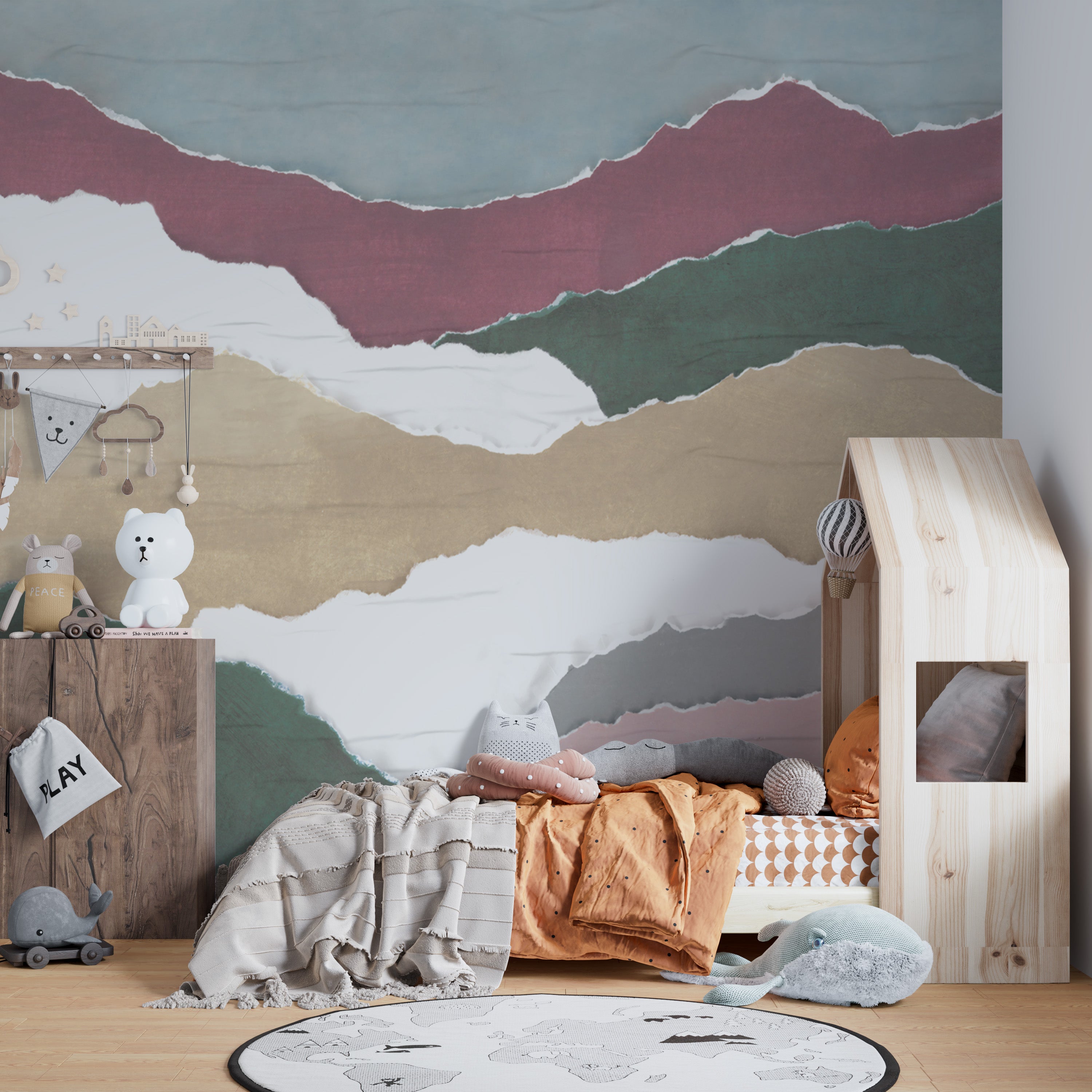 The abstract torn paper wallpaper features layered textures and organic shapes, creating a striking visual effect. Inspired by natural landscapes, this modern mountain mural wallpaper blends muted green, beige, pink, and maroon tones for a soft, contemporary look. The torn paper effect wallpaper adds depth and character, making it ideal for living rooms, bedrooms, or creative spaces. Its earth-tone abstract wallpaper design complements minimalist and modern interiors, offering a subtle yet eye-catching feature. Perfect for those seeking a nature-inspired abstract wallpaper with a unique, textured finish that brings a contemporary touch to any room.