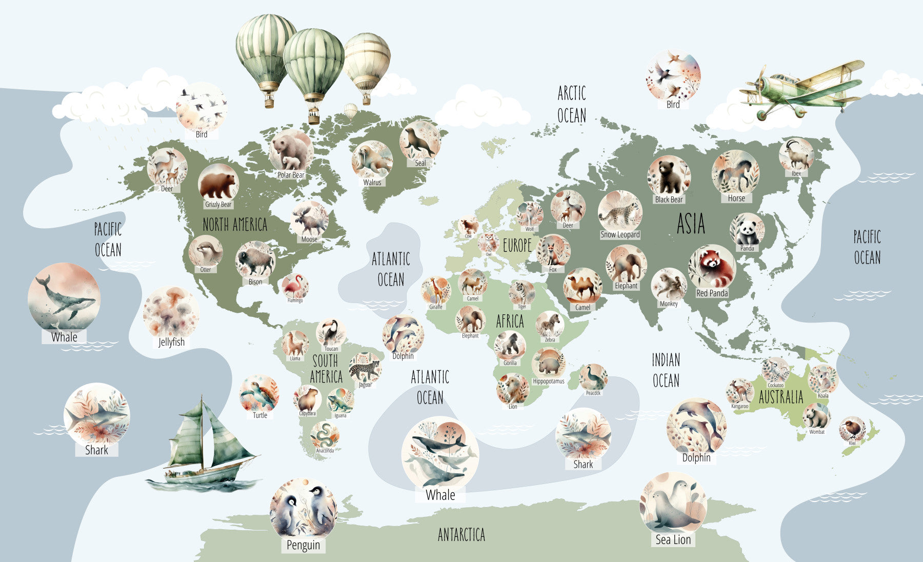 Explore the world with this whimsical animal map! This delightful design features watercolor illustrations of animals around the world. Soft pastel colors create a gentle, engaging atmosphere. The style adds charm to any room. This engaging wallpaper for walls is a wonderful fit for a nursery, kid's room, or playroom. Inspire a love of geography and wildlife while complementing interiors with a touch of wonder and curiosity.