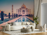 Transform your living space with the Agra's Jewel wallpaper for walls. This image captures the majestic Taj Mahal in a soft sunrise glow, bringing an iconic world landmark into your home. The design features gentle blues and warm oranges, creating a soothing and sophisticated atmosphere. The mirrored reflection in the foreground enhances the symmetrical beauty of the architecture, ideal for feature walls in living rooms, bedrooms, or studies. Embrace a blend of history and artistry that makes a stylish and refined statement. Let your walls narrate tales of architectural grandeur and cultural significance.