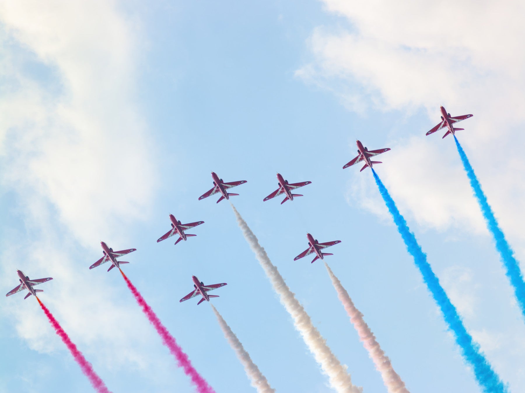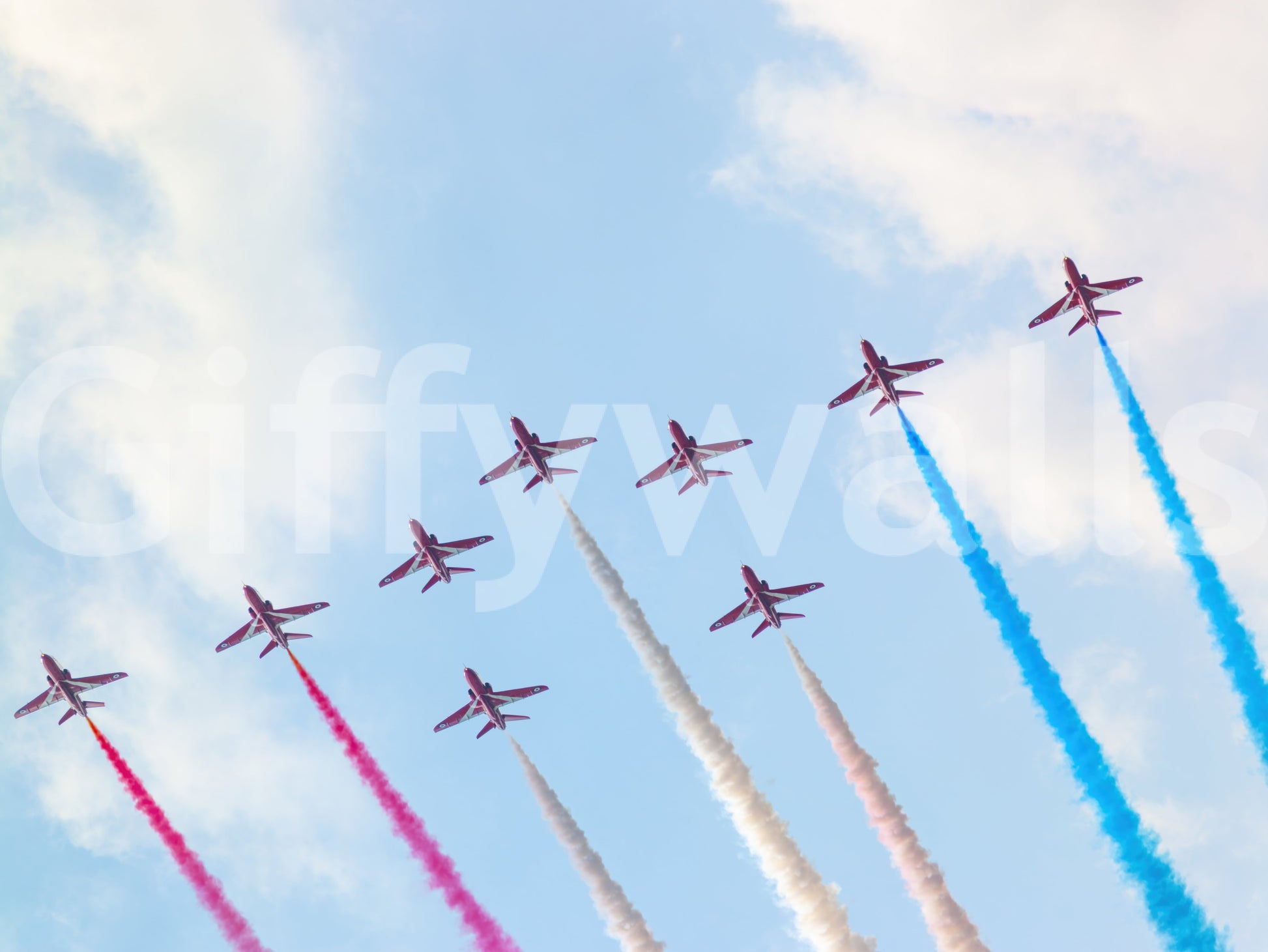 The Red Arrows flying in formation in sky with multi-coloured smoke. Transform your space with the breathtaking spectacle of an air show. This wallpaper for walls captures the dynamism of synchronised jets streaking across a pale blue sky, leaving trails of vibrant colour in their wake. The bright, clean palette invigorates rooms with a sense of wonder and exhilaration. Ideal for a child’s bedroom, a modern living room, or even a home office, this design injects energy and visual interest. This pattern gives an illusion of movement, enlivening spaces and fostering a bold and cheerful atmosphere. The crisp details and colourful trails complement both minimalist and maximalist interiors.