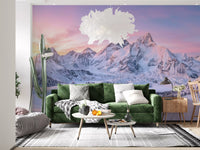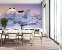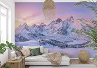 Experience the peaceful majesty of a mountain dawn with this exceptional wallpaper for walls. It showcases a sweeping panorama of snow-laden peaks, illuminated by the delicate alpenglow. Hues of soft rose, lavender, and pale blue gracefully transition across the morning sky, perfectly complementing the vast, untouched snowscapes. A serene, frozen lake rests amidst a valley of frosted pine trees, evoking a profound sense of quietude and natural expanse. This detailed design projects calm and awe into any interior. It enhances living rooms, bedrooms, or dedicated study areas, establishing a sophisticated backdrop that elevates the room's ambience and offers an inspiring, spacious view.