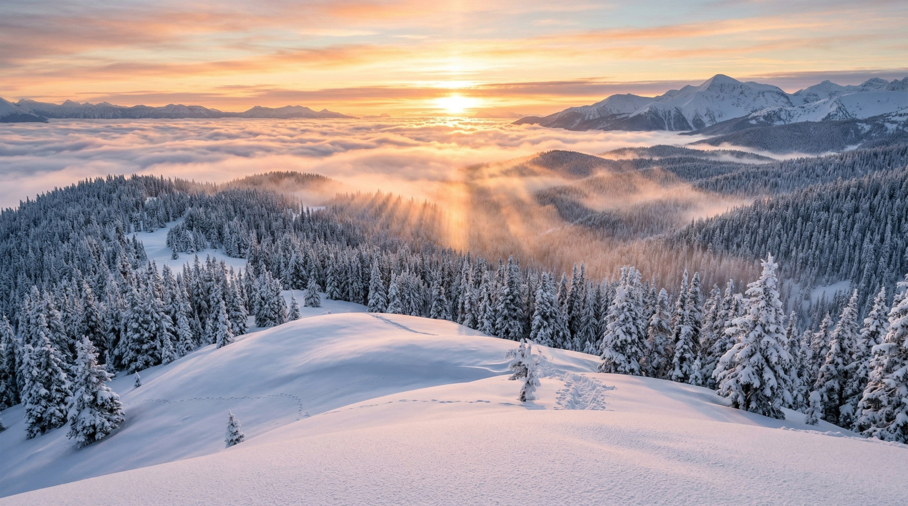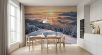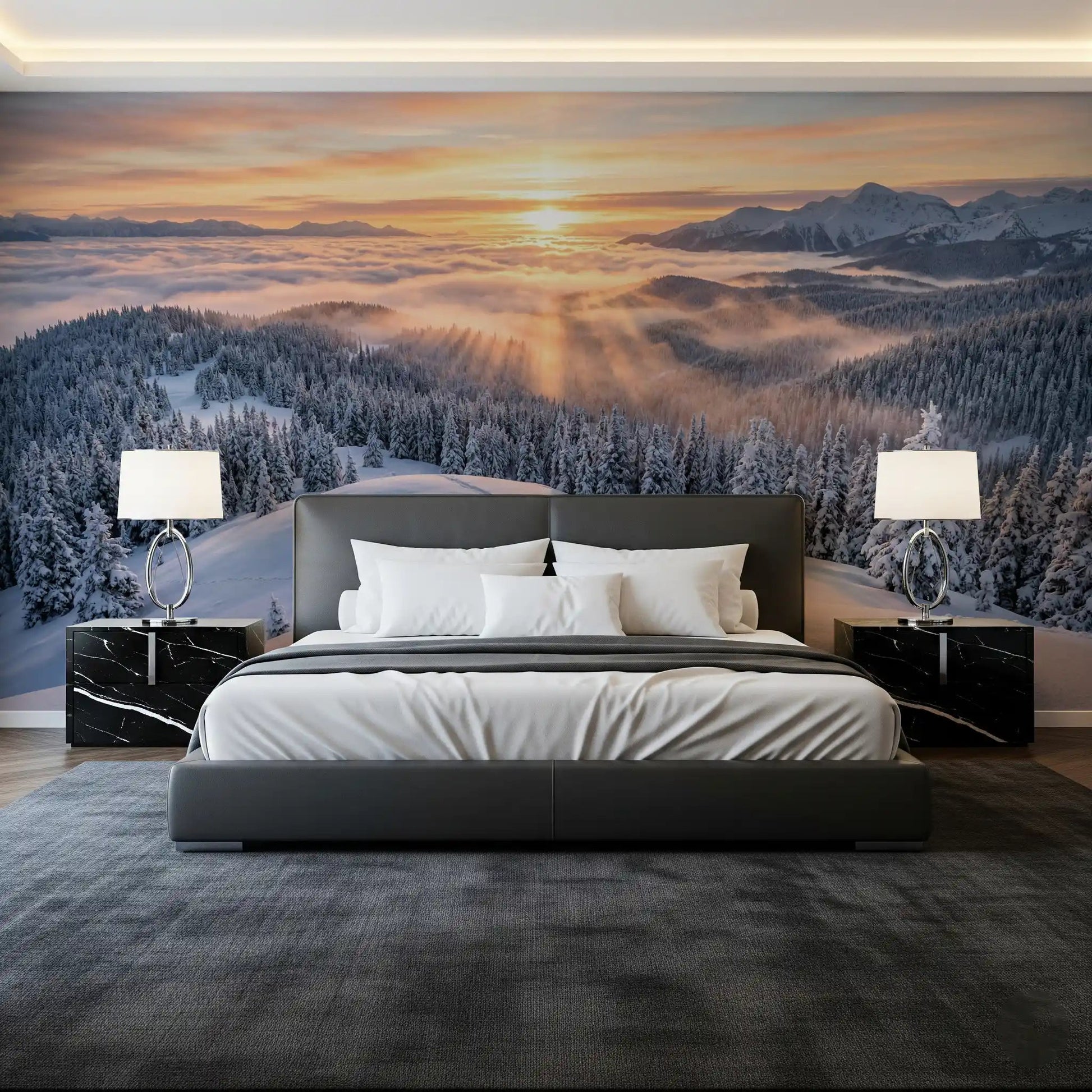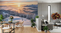 This stunning wallpaper for walls captures a breathtaking winter panorama, showcasing snow-dusted mountains and a serene forest blanketed in fresh powder. Golden sunbeams pierce through a soft cloud inversion, casting a warm, ethereal glow across the frosty landscape. The colour palette blends cool blues and crisp whites of the snow with vibrant oranges, pinks, and peaches from the sunrise. This design creates a magnificent focal point, transforming any interior space into a tranquil mountain escape. It enhances living rooms, bedrooms, or dining areas by inviting a sense of peace and expansive beauty indoors. The majestic scene evokes calm and wonder, complementing both modern and rustic décor styles.