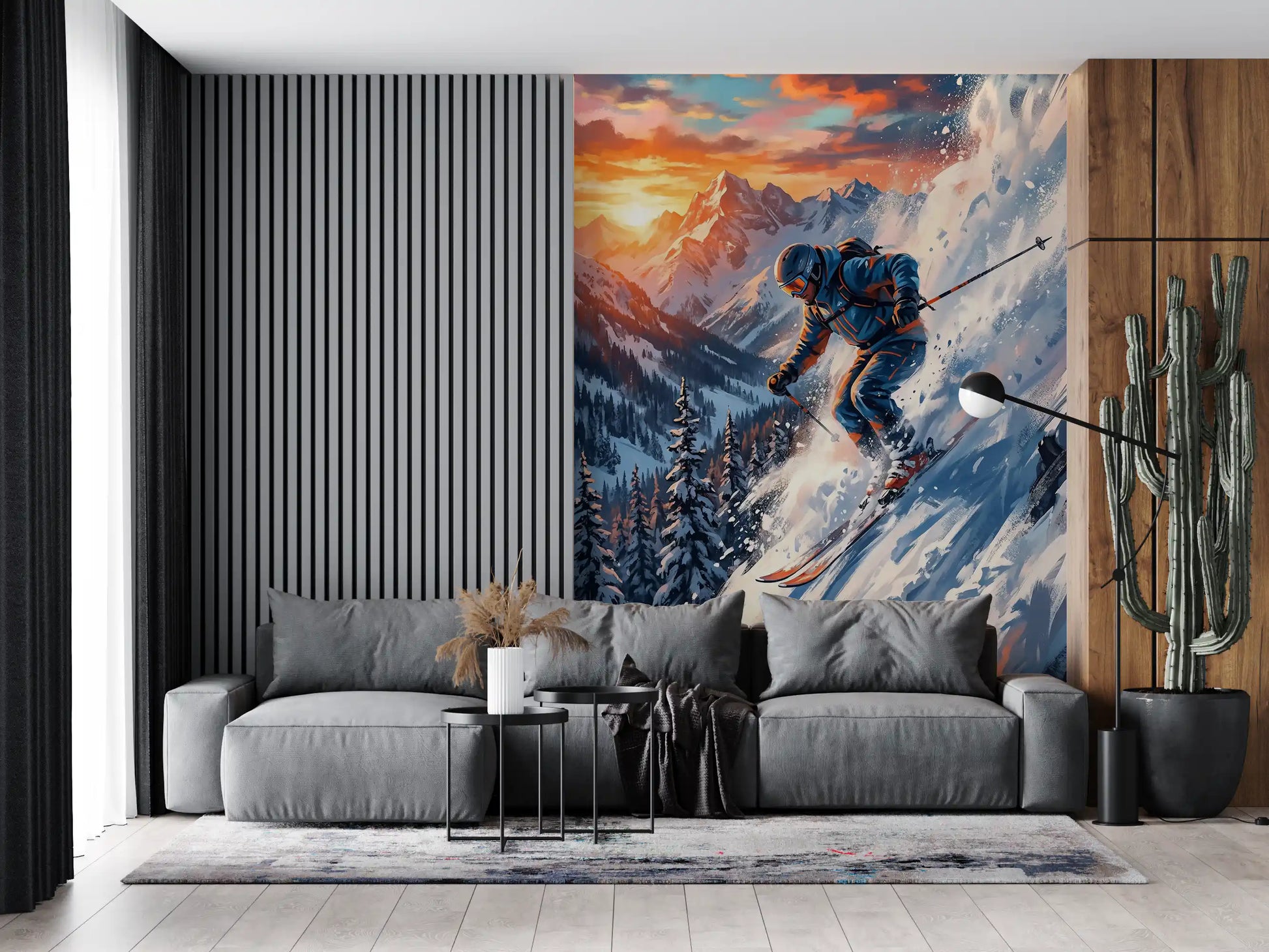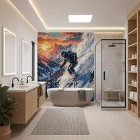 This stunning wallpaper captures the exhilarating motion of a skier descending a snow-covered mountain at sunrise or sunset. Dynamic brushstrokes create a sense of speed, with snow spraying energetically around the skier. The vibrant colour palette blends warm oranges, reds, and yellows of the sky with cool blues and whites of the snow and distant peaks. Dark pine trees line the lower slopes, adding depth to the vast landscape. This design transforms any interior space, injecting adventurous energy and artistic flair. It works perfectly in living rooms, home offices, or a bold bedroom, inspiring a love for extreme sports and breathtaking natural beauty. The rich colours and active composition make it a striking focal point, complementing modern or contemporary decor with a spirited touch.