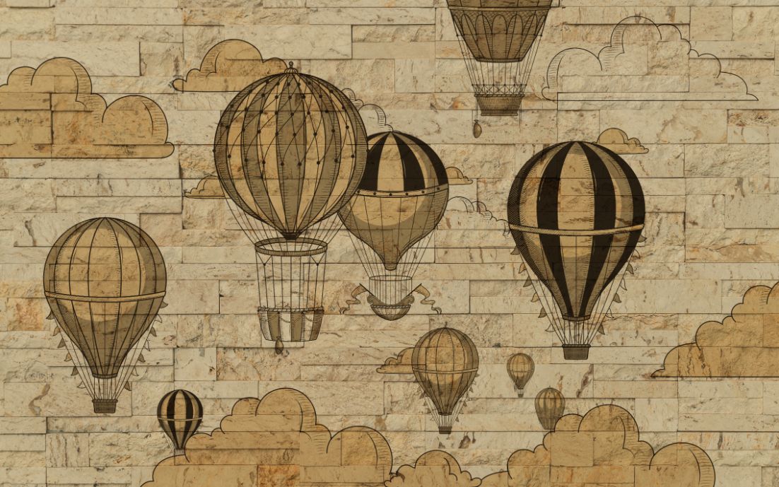 Hot air balloons in 3D wallpaper with beige stone texture.