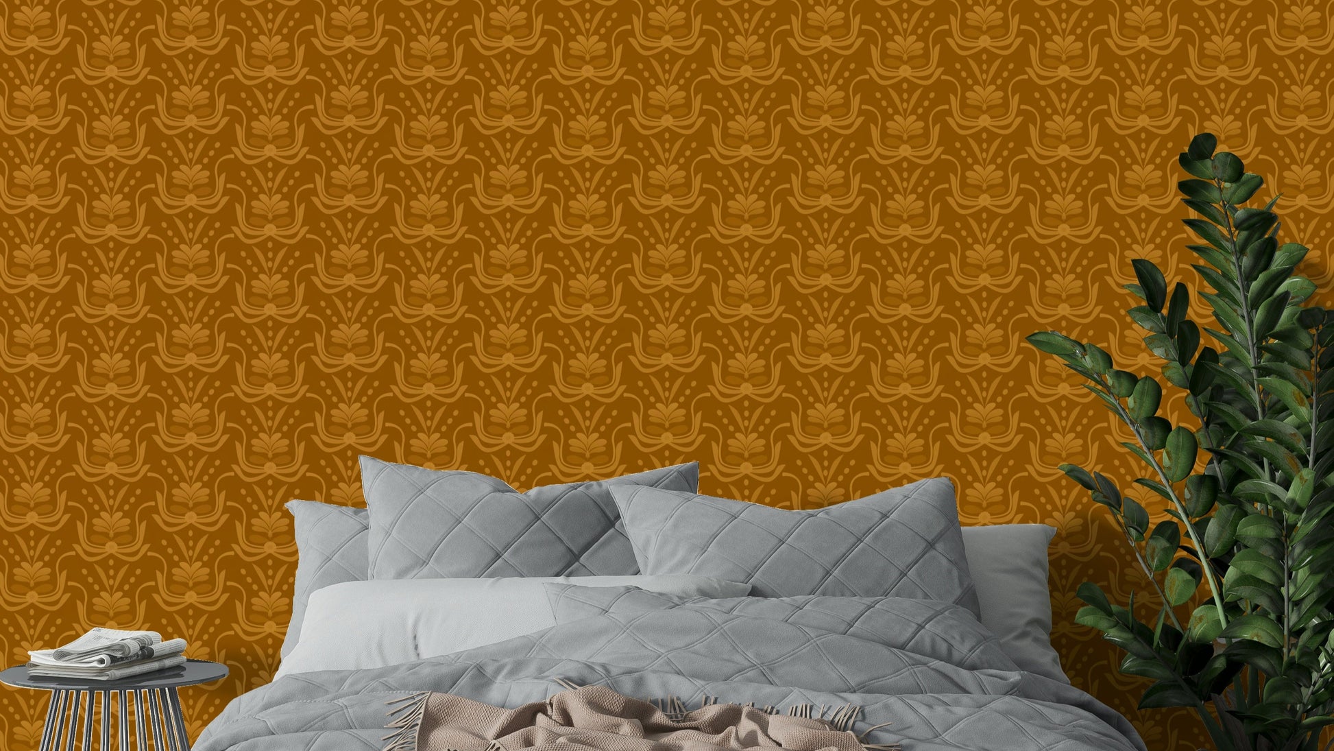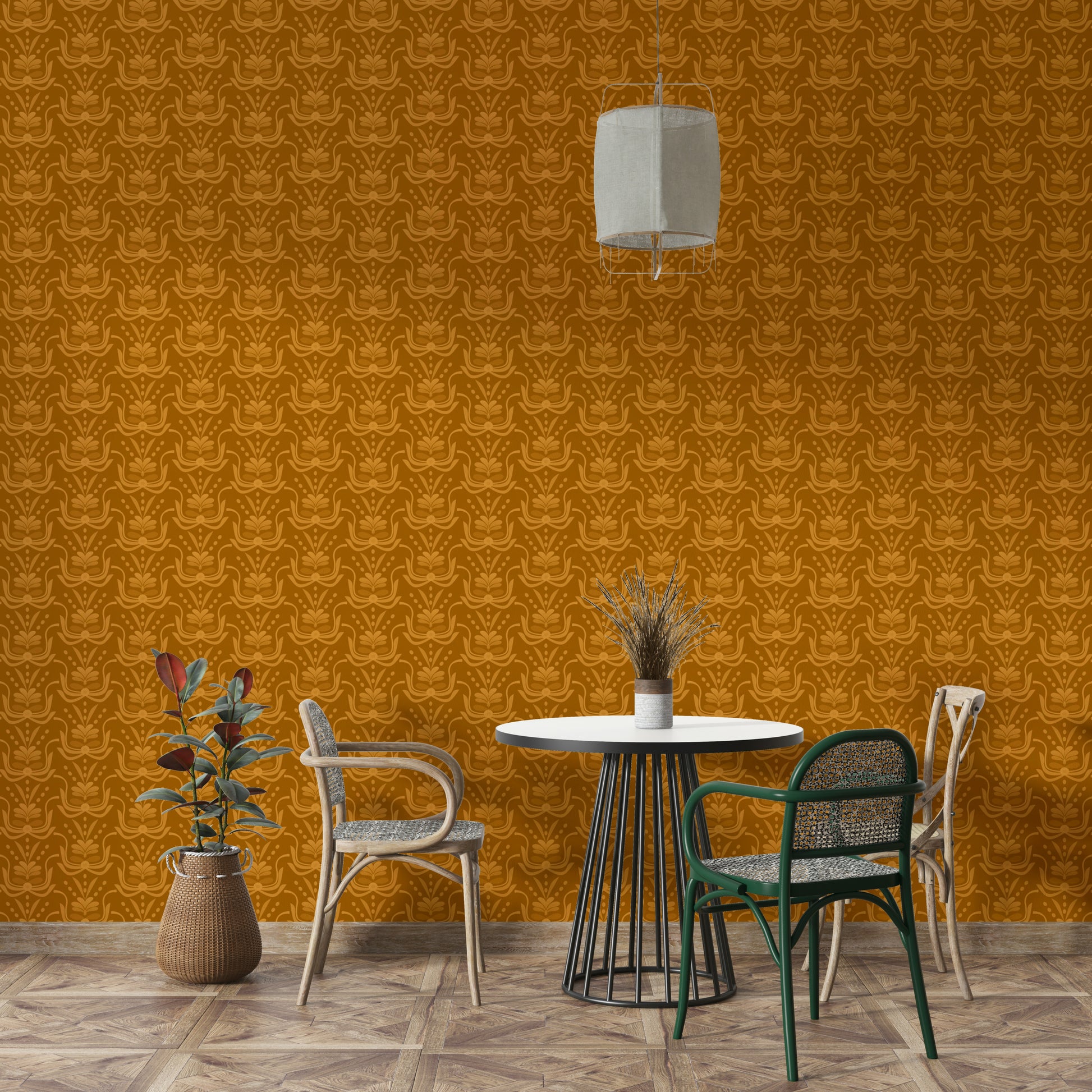 This wallpaper showcases a captivating seamless pattern of stylized floral motifs in warm amber tones. The design, reminiscent of Art Deco elegance with a modern twist, features a rich, saturated brown backdrop that accentuates the lighter, almost ochre-like floral elements. The repeating pattern creates a sense of sophisticated rhythm and visual harmony, making it suitable for various interior spaces. The overall effect is one of warmth, understated luxury, and timeless style, perfect for adding a touch of refined elegance to any room.