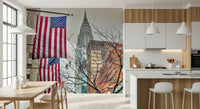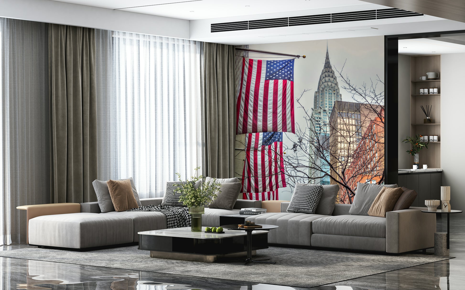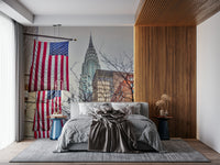 Bring the spirit of New York City to your walls with this inspiring wallpaper. The iconic Chrysler Building stands tall, juxtaposed with the waving American flag. The soft greys, reds, and blues offer a calming yet dynamic visual. Ideal for a study, living room, or even a bedroom, this wallpaper for walls infuses a space with a sense of urban sophistication. Its blend of patriotic symbols and architectural marvels enhances interior aesthetics, creating a unique and stylish atmosphere. Welcome the American Dream into your everyday life.