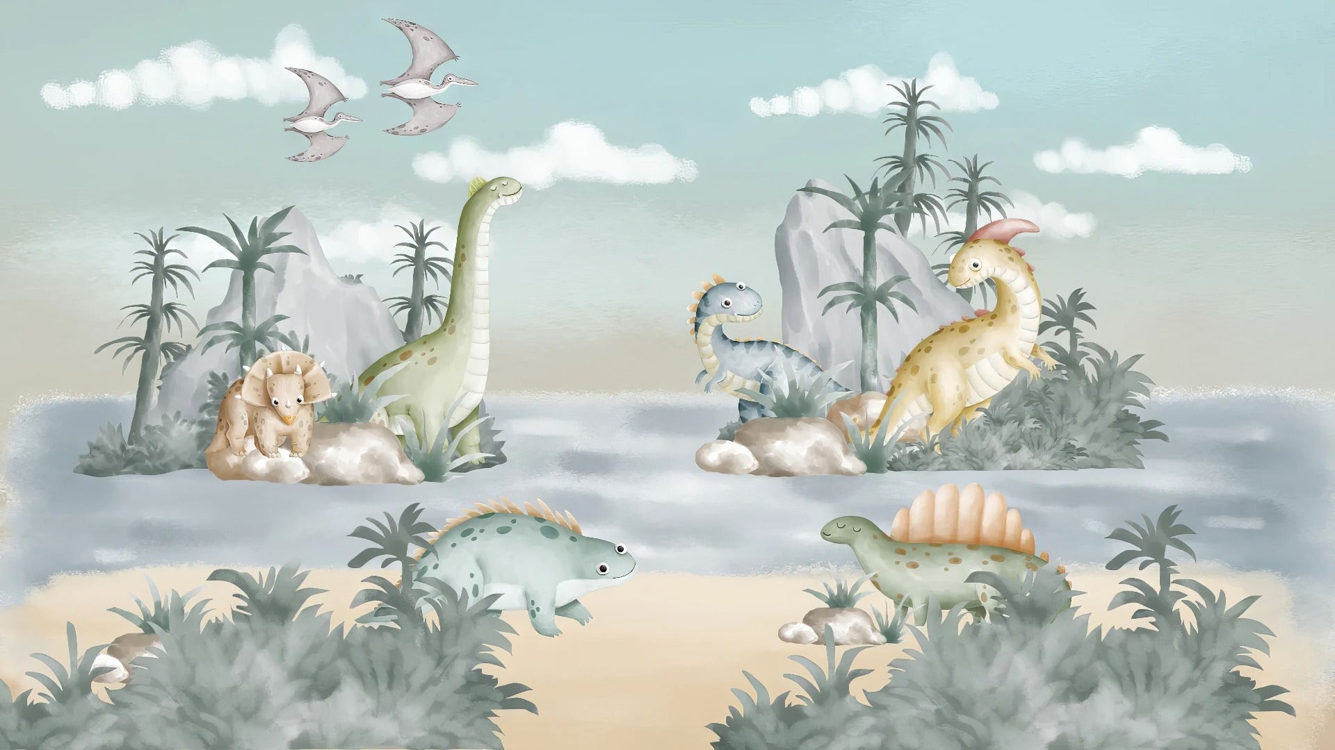 Embark on a time-traveling journey with the ancient adventures wall mural, the perfect addition to any kids room wallpaper collection. This vibrant mural showcases a lively prehistoric scene, brimming with friendly dinosaurs in a lush landscape that sparks young imaginations. The rich, playful colors and gentle giants that grace this piece are sure to captivate and inspire endless adventures. Crafted with precision, it's more than just wallpaper it's a backdrop for learning and fun. Watch as your little ones' stories come to life before their eyes, creating a room that's as educational as it is whimsical.