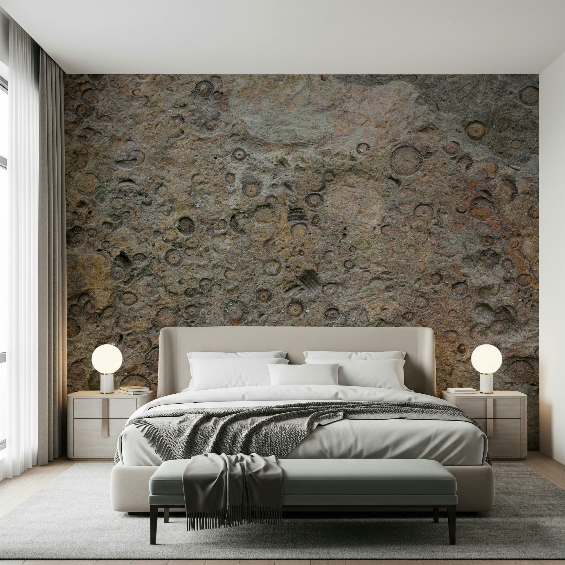 Introduce a touch of history with this Ancient Fossil Texture wallpaper for walls. This design simulates the surface of aged stone, complete with embedded fossil patterns in brown and beige tones. It's ideal for adding depth and character to studies, dining rooms, or hallways. This distinctive pattern complements various interior styles, from classic to bohemian. Transform your home with this sophisticated wallpaper.