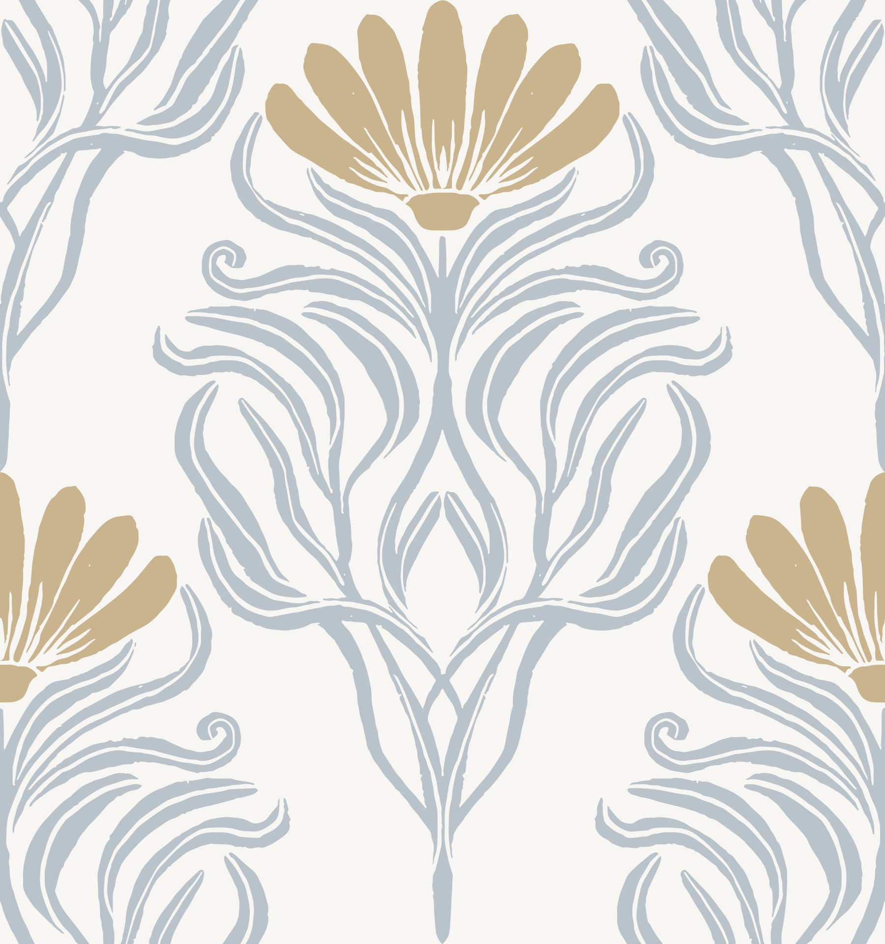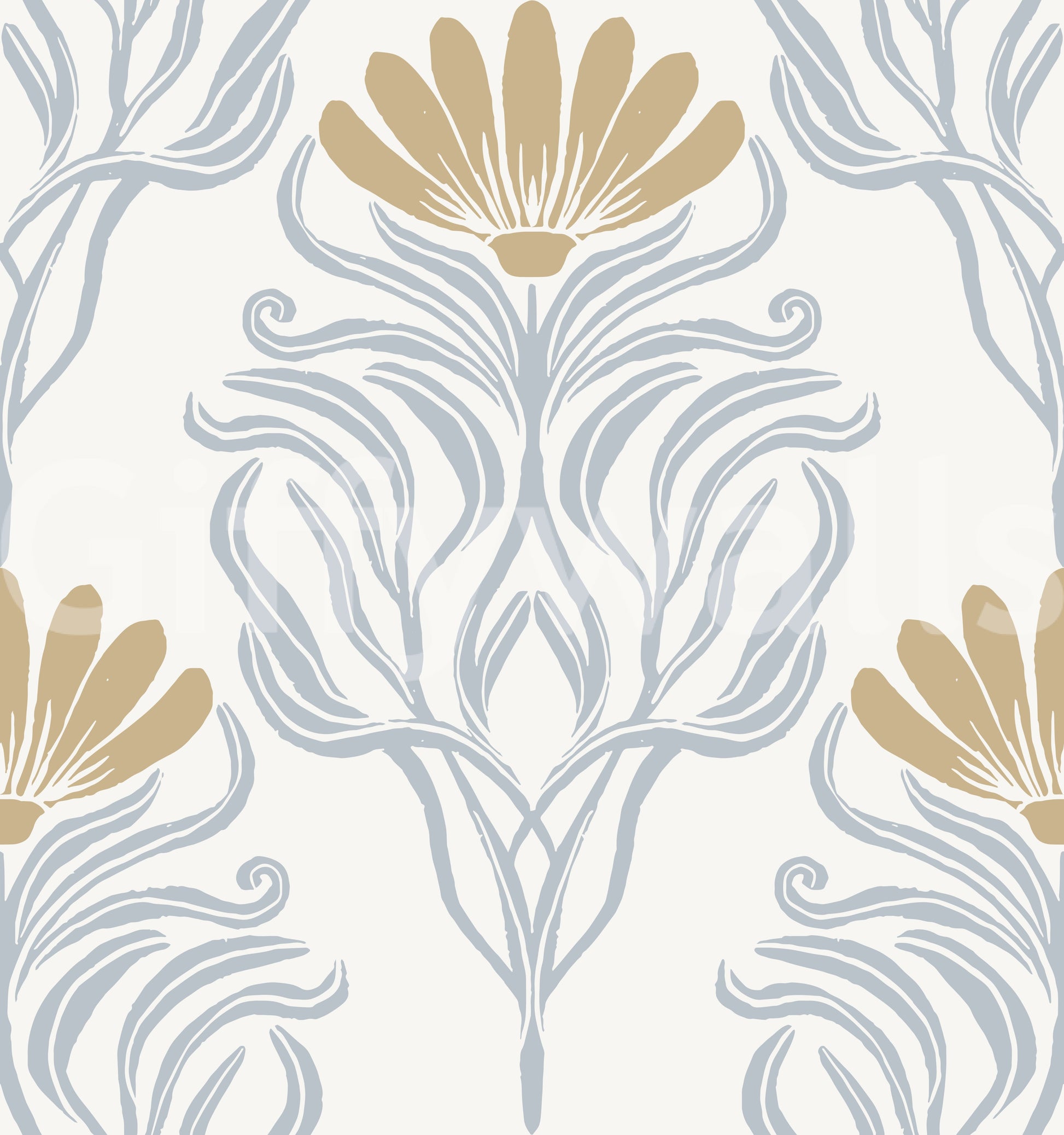 Embrace timeless elegance with this "Ancient Motif Pattern" wallpaper. The design features a captivating interplay of stylized floral elements, reminiscent of ancient art. Soft, muted tones of dusty blue and beige create a serene and sophisticated atmosphere. The repeating pattern of stylized flowers and flowing leaves evokes a sense of tranquility and classic beauty, perfect for adding a touch of history and refined style to any space. Its subtle yet striking design works beautifully as a calming backdrop, complementing various interior styles from modern minimalism to classic traditional settings. The handcrafted feel of the design adds a unique charm and warmth to the overall aesthetic, making this wallpaper a captivating choice for those seeking a peaceful and sophisticated environment.