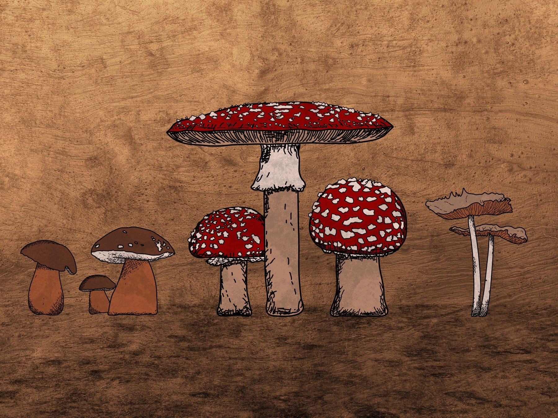 Earthy woodland Ancient Mushrooms drawing, rich texture wallcovering.