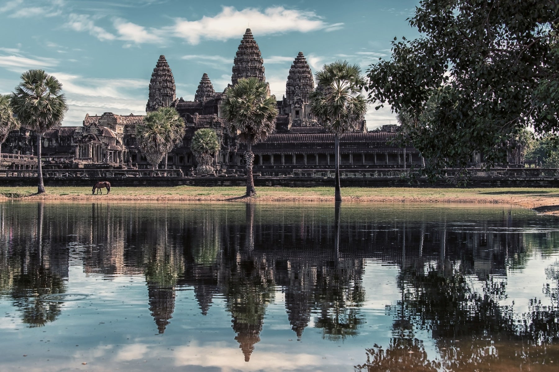 A beautiful Angkor Wat wallpaper mural reflecting in water.