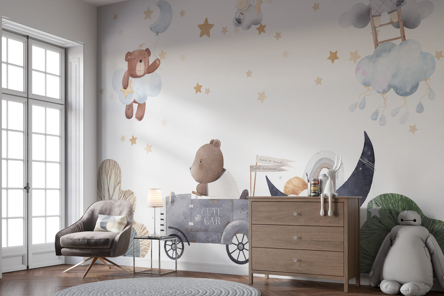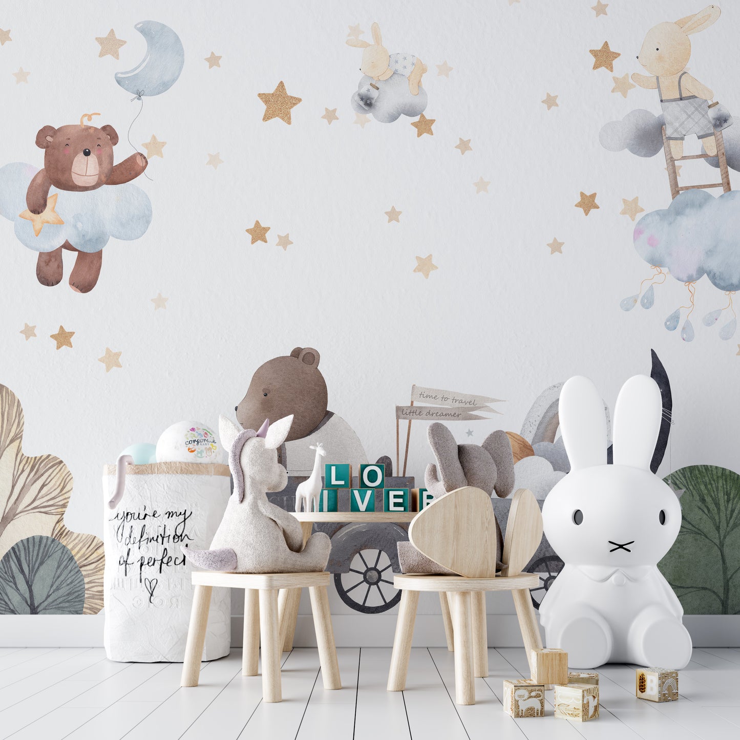 Dive into a world where teddy bears and bunnies sail among stars and dreamy clouds. This nursery wallpaper for an animal dream fantasy wall mural captures a delightful animal fantasy, perfect for surrounding your little one with sweetness and wonder. Each element, from the softly colored clouds to the twinkling stars, is designed to foster a calming, joyful nursery environment. Unlike traditional designs, this wallpaper offers a touch of magic, making every bedtime or playtime a dreamy escape. The gentle hues and playful scenes are not only visually pleasing but also spark imagination in young minds. Available in various dimensions to fit any wall size, it offers both visual appeal and a touch of whimsy to any nursery setting. Shop for this captivating mural today and create a magical space for your child.