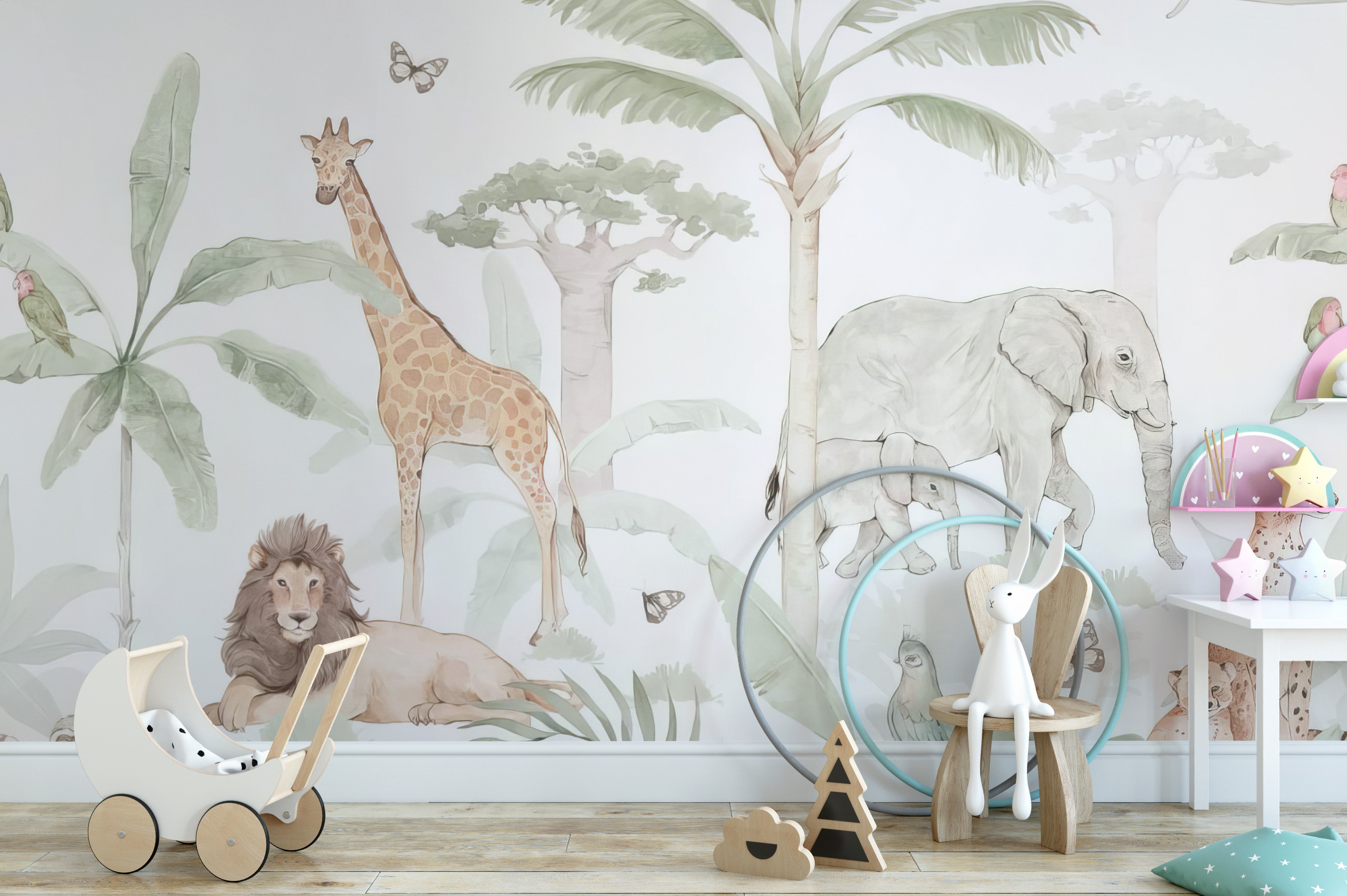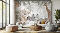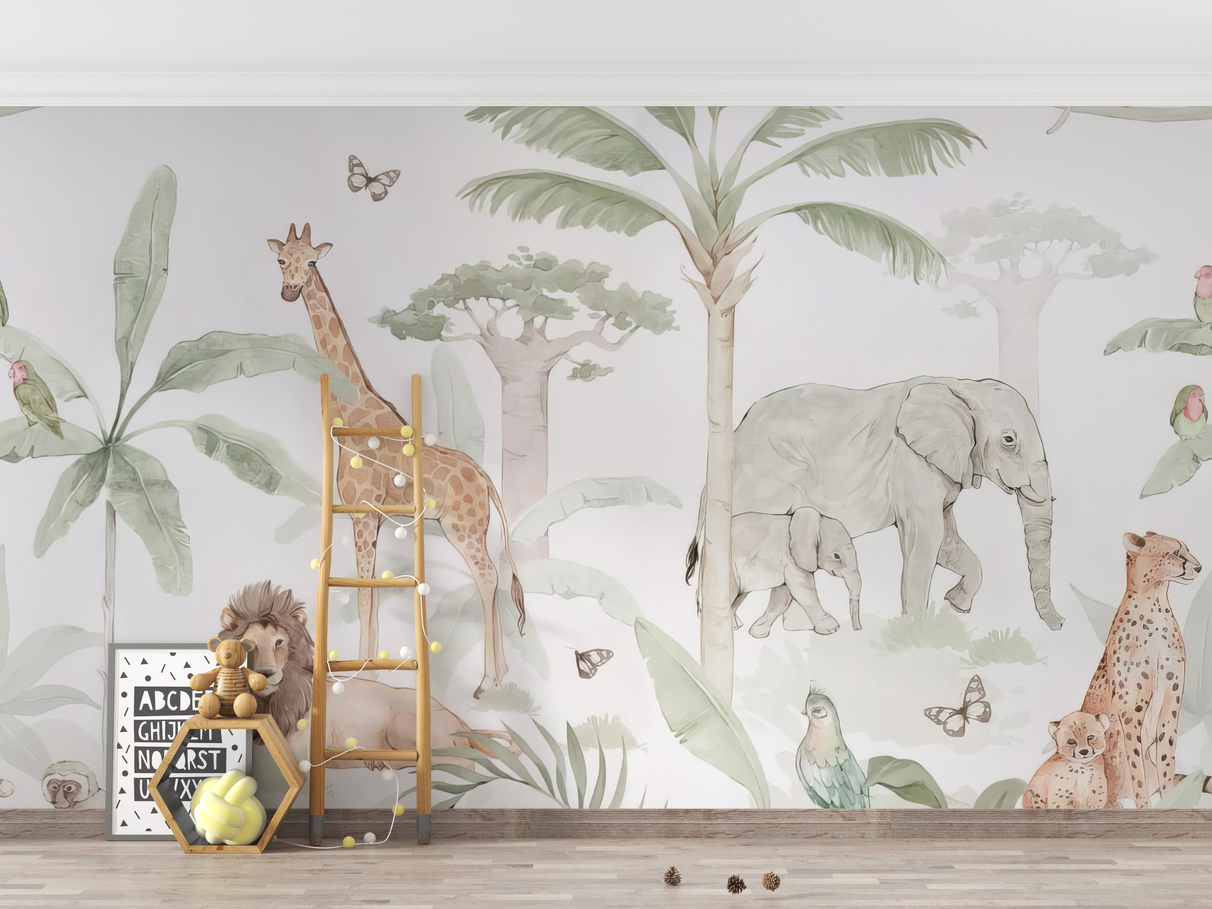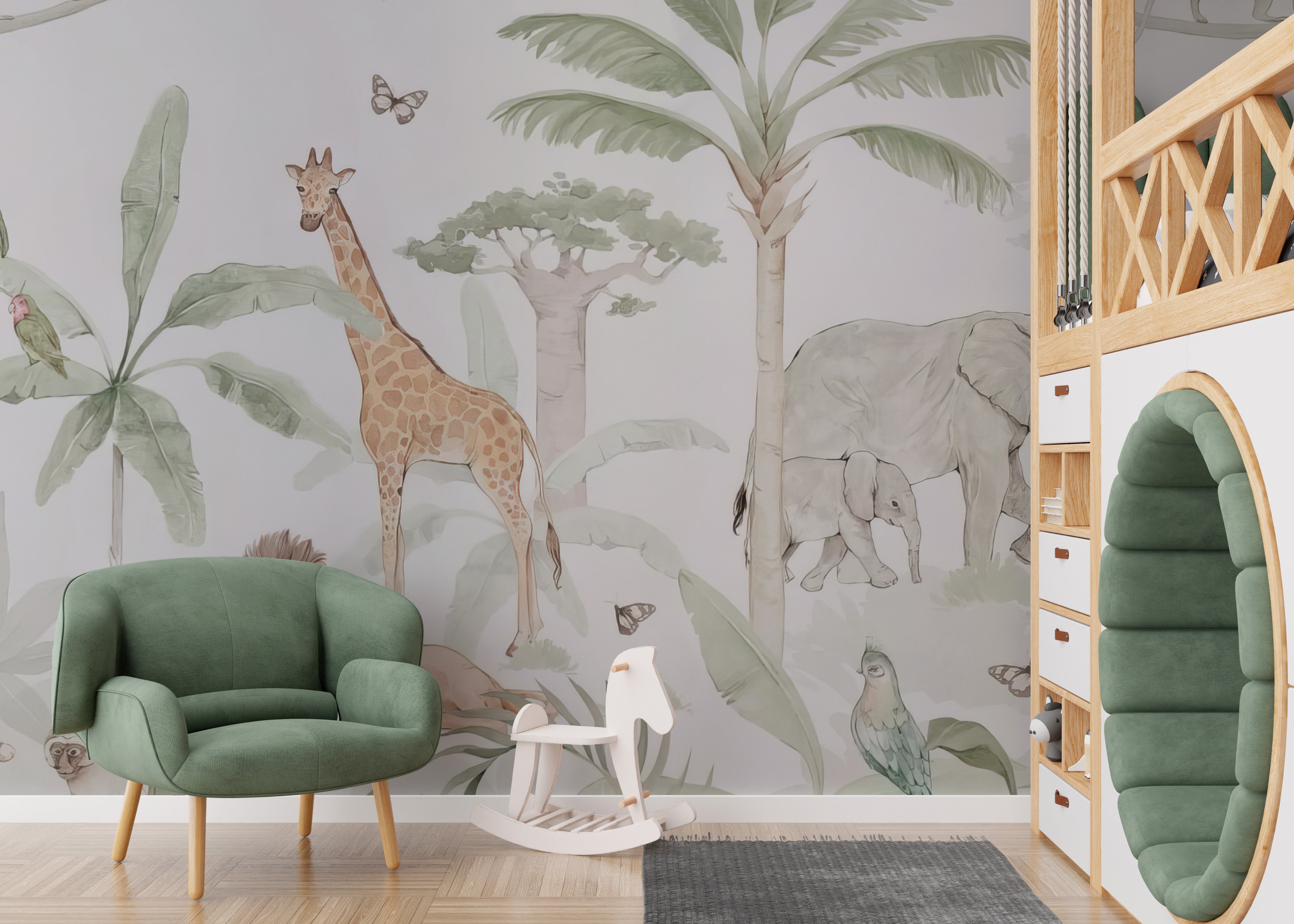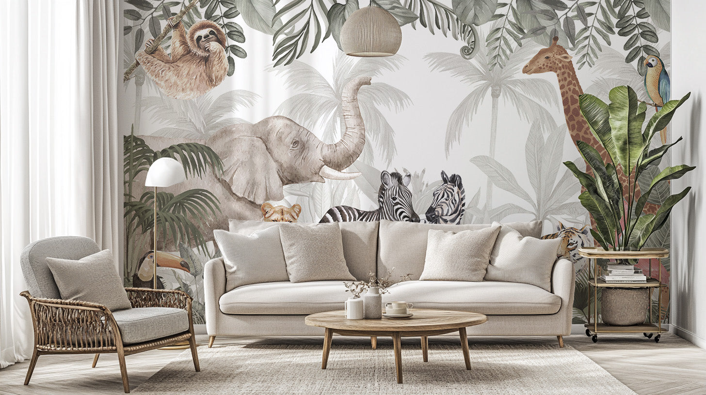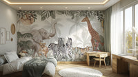 Invite the wild indoors with our animal forest wall mural. A lush, whimsical tableau unfolds across your wall, featuring gentle giraffes, wise elephants, and secretive leopards. This animal wallpaper captures nature's serene beauty, offering a captivating backdrop that enchants viewers, young and old. It's a gateway to a world where the magic of the animal kingdom gently resides in your own habitat.