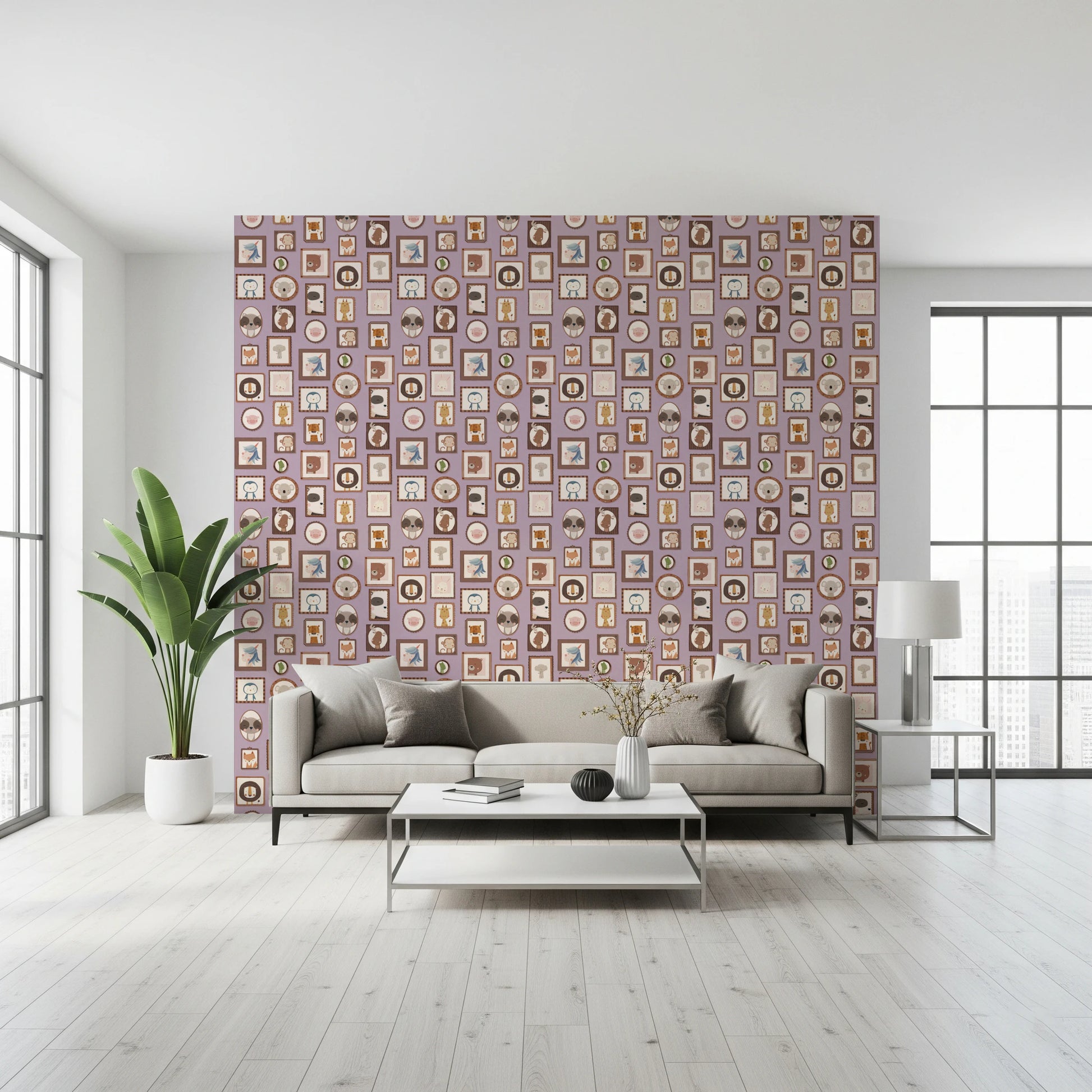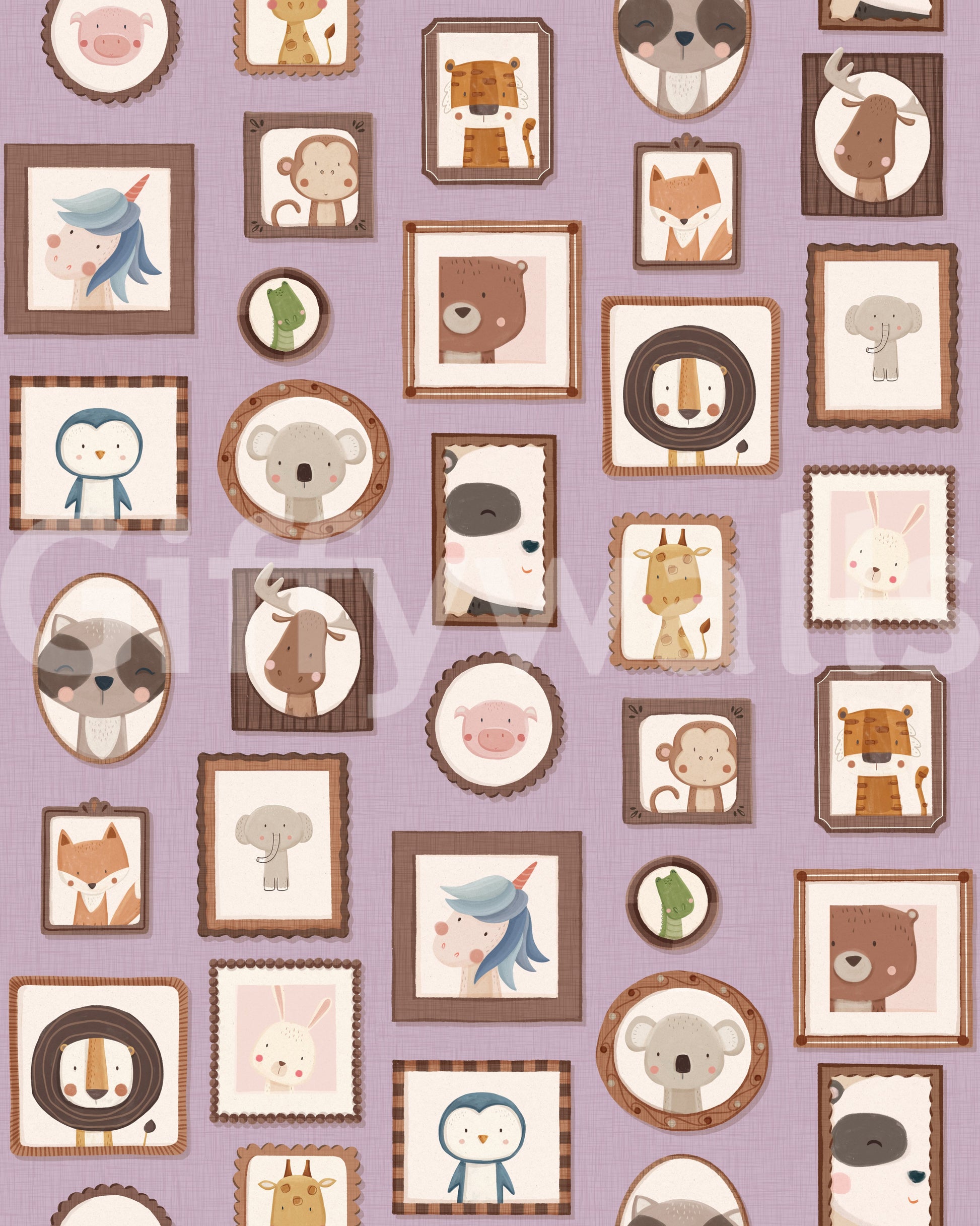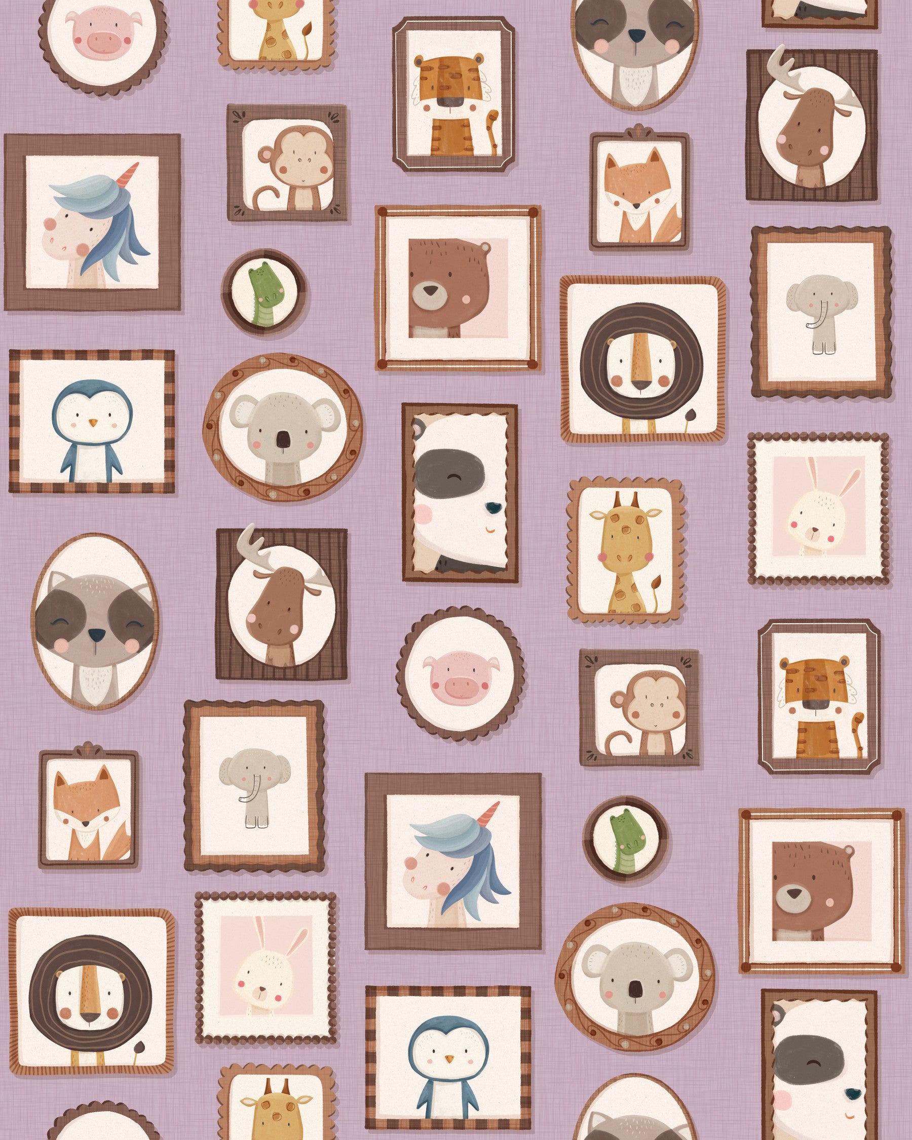 Transform your walls with this charming collection of framed animal portraits. The design showcases a variety of cute creatures, including lions, bears, penguins, and unicorns, each presented in a unique, decorative frame. The soft colour palette of lilac, beige, and brown creates a calming and inviting atmosphere. This wallpaper for walls is ideal for kids' rooms, nurseries, or playrooms. It adds a touch of whimsy and sophistication while enhancing the overall décor with its adorable characters and delightful arrangement. Instantly create a cosy and playful space.