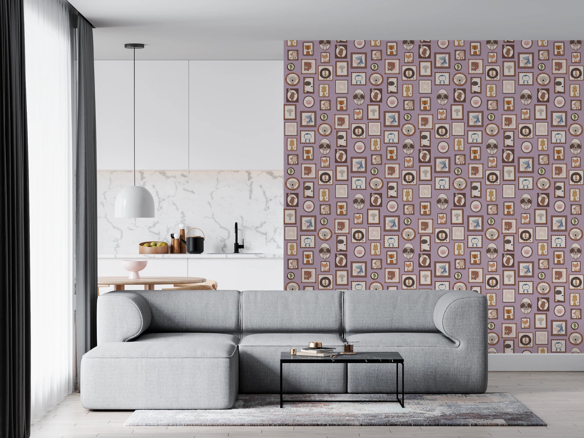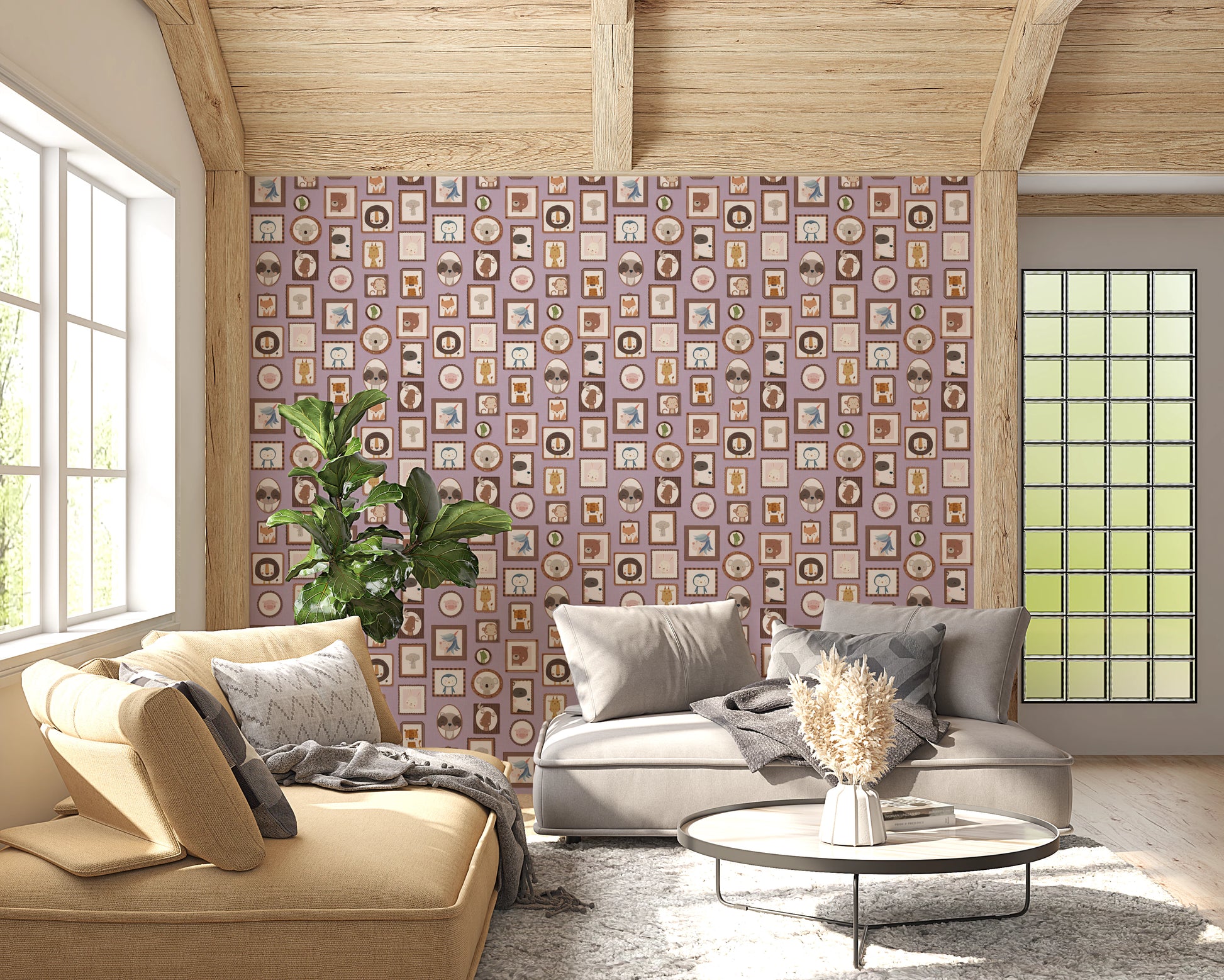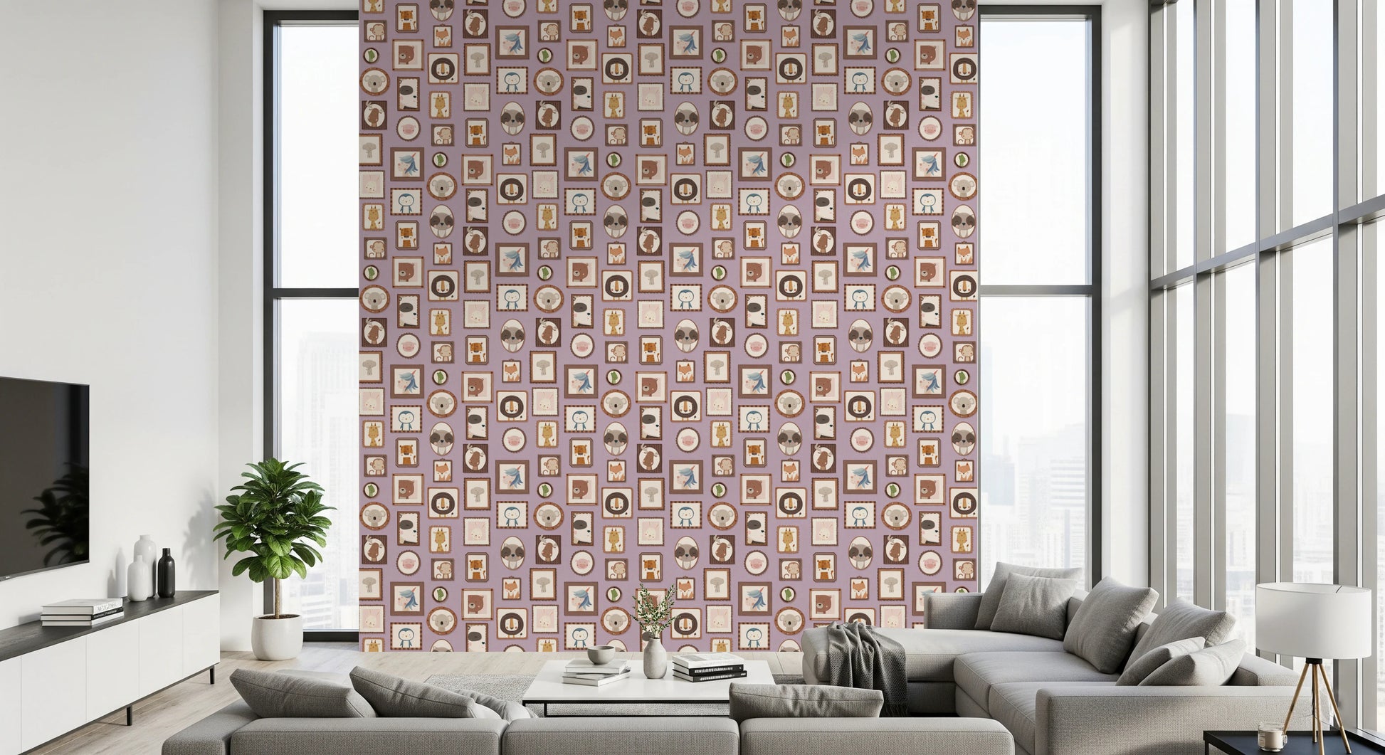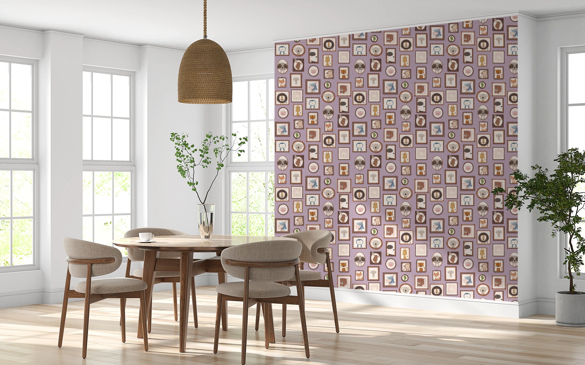 Transform your walls with this charming collection of framed animal portraits. The design showcases a variety of cute creatures, including lions, bears, penguins, and unicorns, each presented in a unique, decorative frame. The soft colour palette of lilac, beige, and brown creates a calming and inviting atmosphere. This wallpaper for walls is ideal for kids' rooms, nurseries, or playrooms. It adds a touch of whimsy and sophistication while enhancing the overall décor with its adorable characters and delightful arrangement. Instantly create a cosy and playful space.