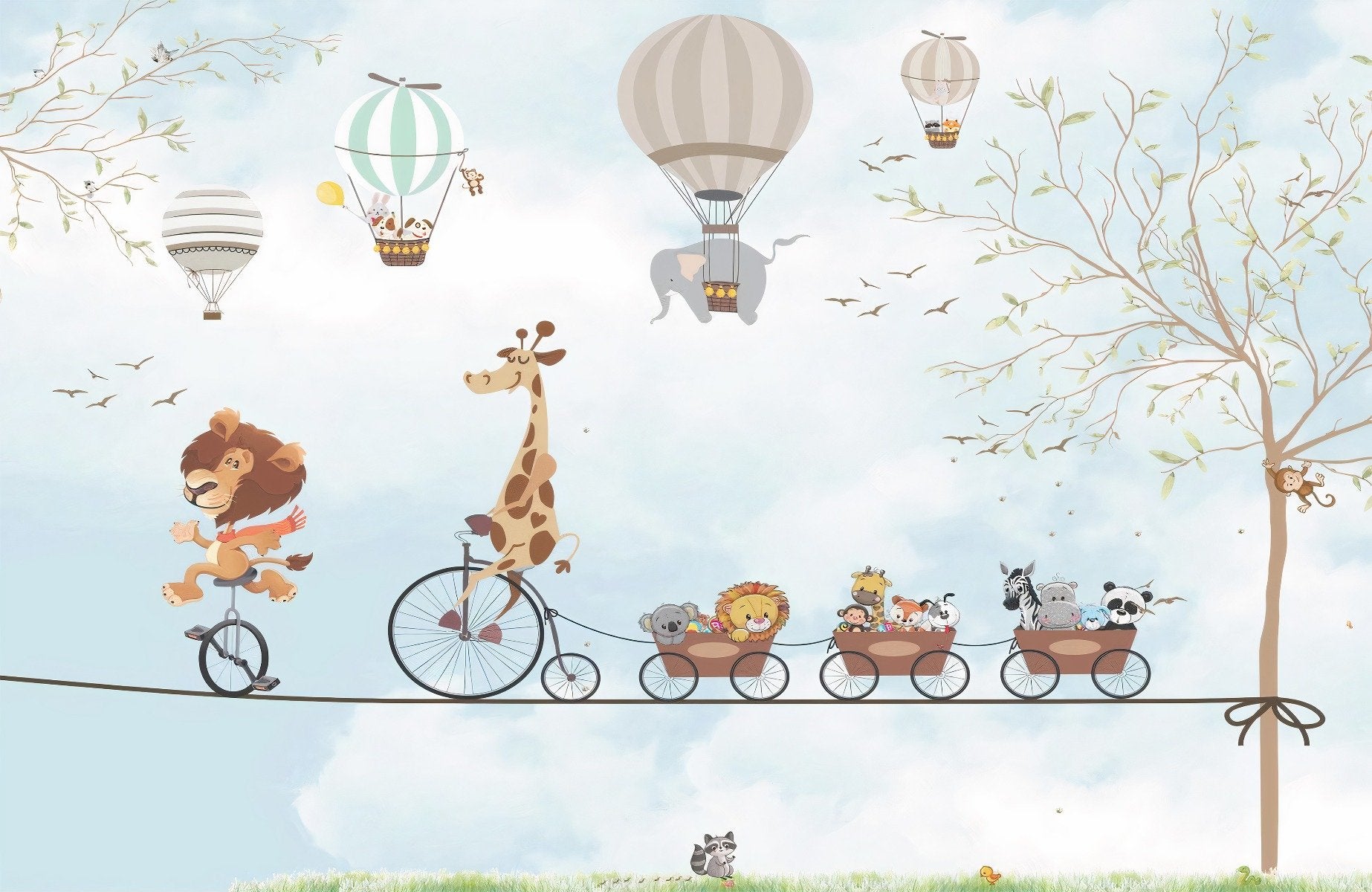 The aerial animal marvels tightrope cycling under skies mural wallpaper is the perfect addition to any kid's room. This beautifully designed wallpaper features a stunning display of animal acrobats performing daring stunts on tight ropes high above the clouds. The attention to detail in this mural wallpaper is truly mesmerizing, and it adds a sense of adventure and whimsy to any space. Your child will love gazing up at the intricate details of each animal, whether it's the clever monkey or the graceful lion. Bring the magic of the animal kingdom into your child's bedroom with this spectacular kids room wallpaper design.