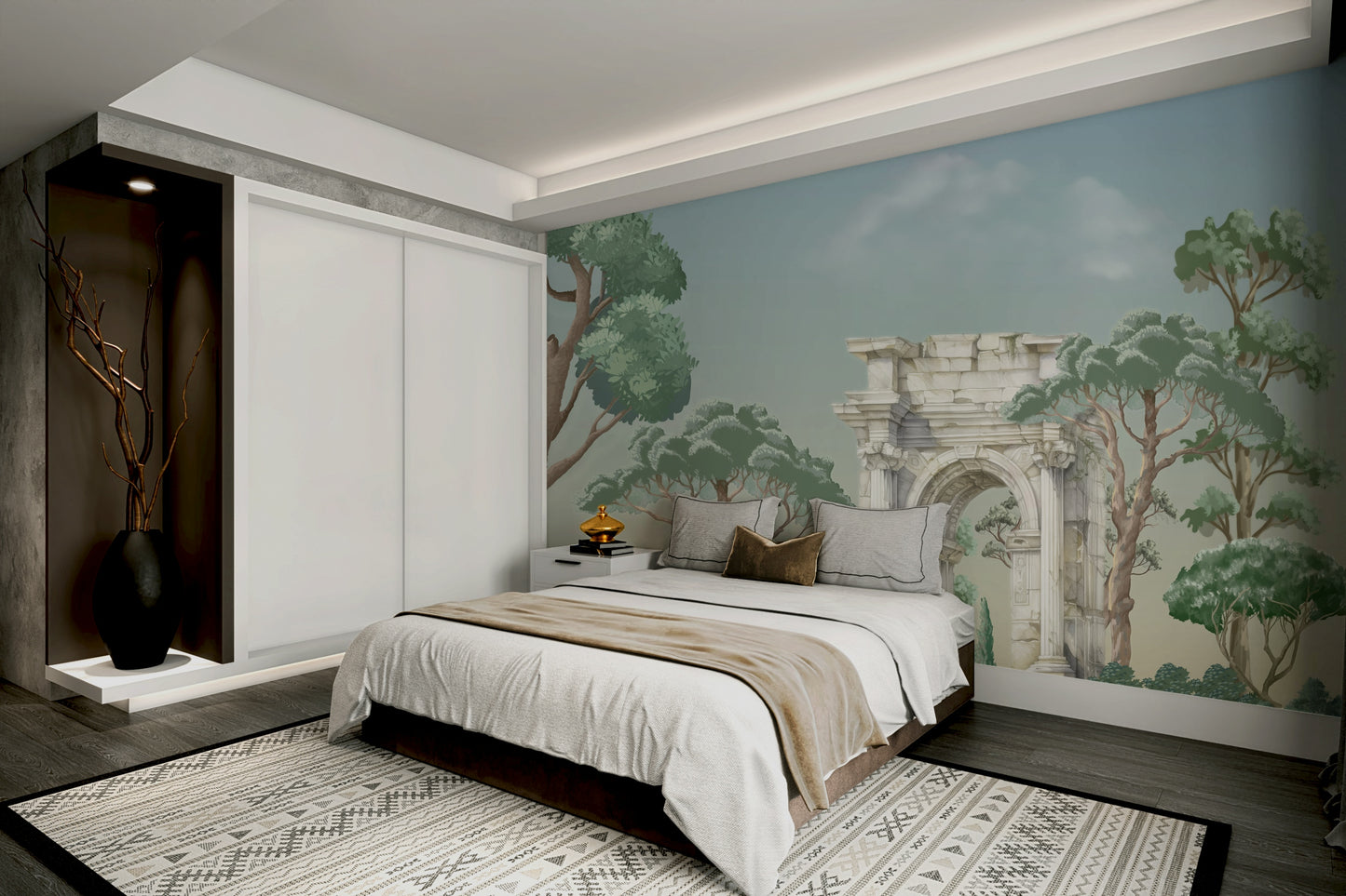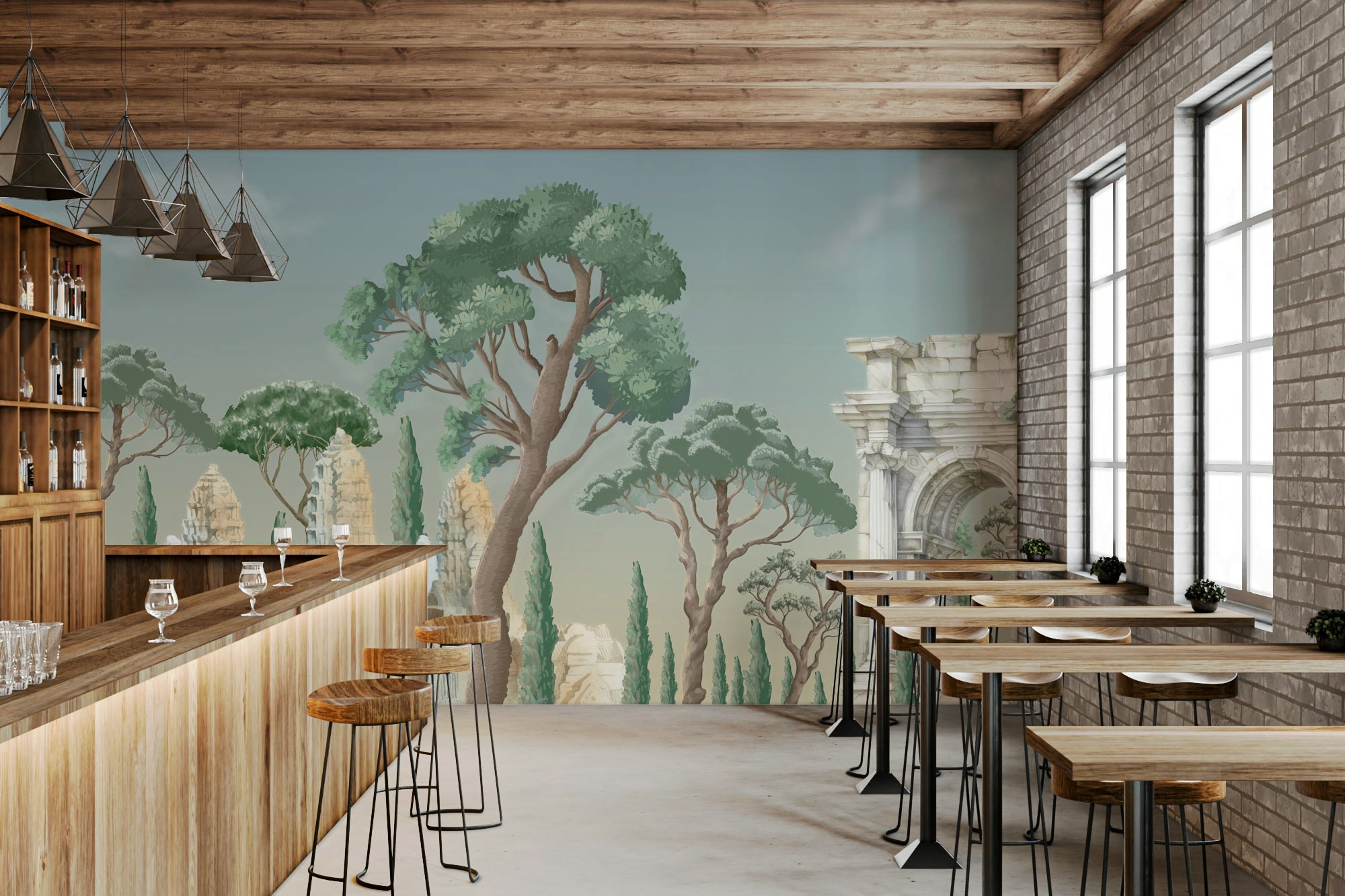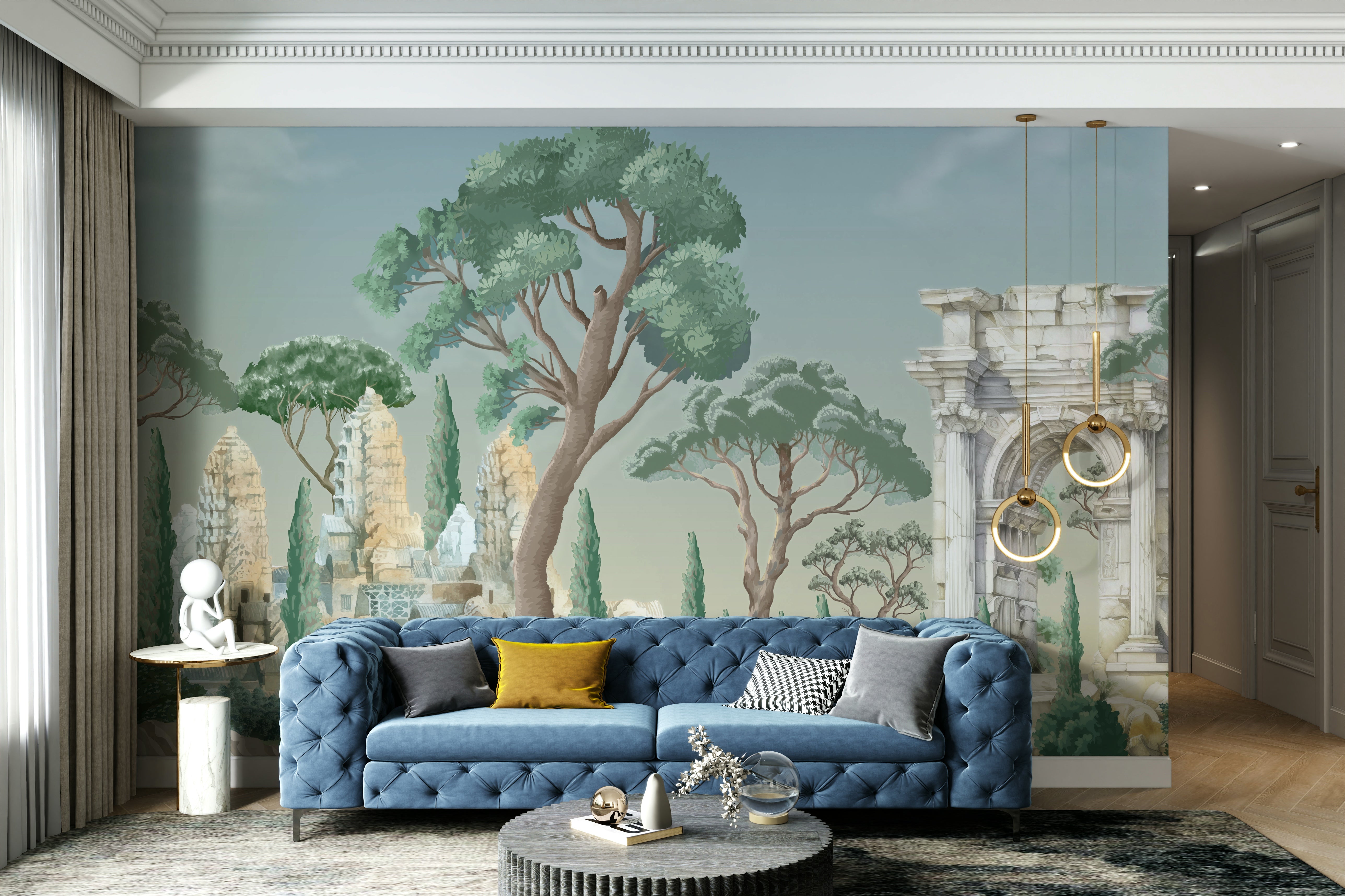 Step into a world of ancient wonder with the Antique Arch & Temple Wallpaper Mural. This exquisite design brings classical architecture to life, featuring majestic stone arches, timeworn temples, and sculpted columns nestled among lush greenery and sky-kissed trees. The soft, painterly style evokes the romance of bygone eras, perfect for creating a refined, timeless ambiance in any room. Ideal for living spaces, studies, or hallways, this mural adds depth and a touch of historical grandeur to your walls. Let your home tell a story of ancient elegance and enduring beauty with this sophisticated wallpaper masterpiece.